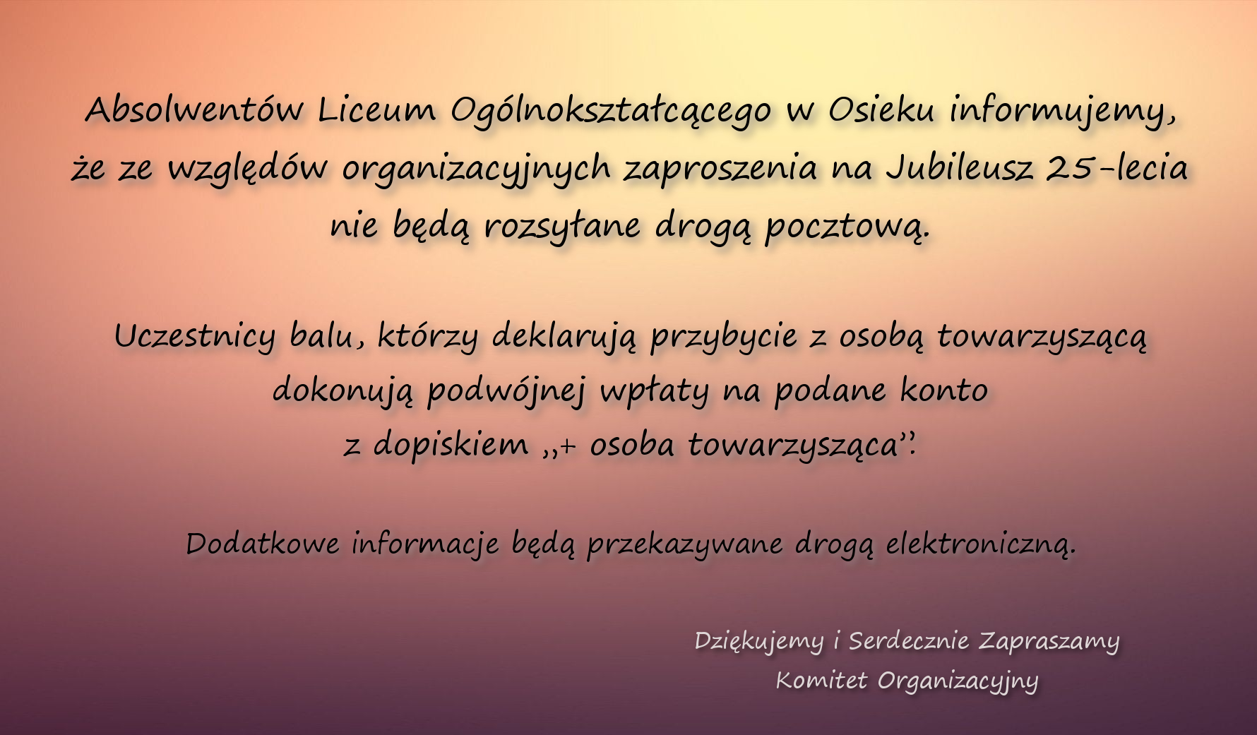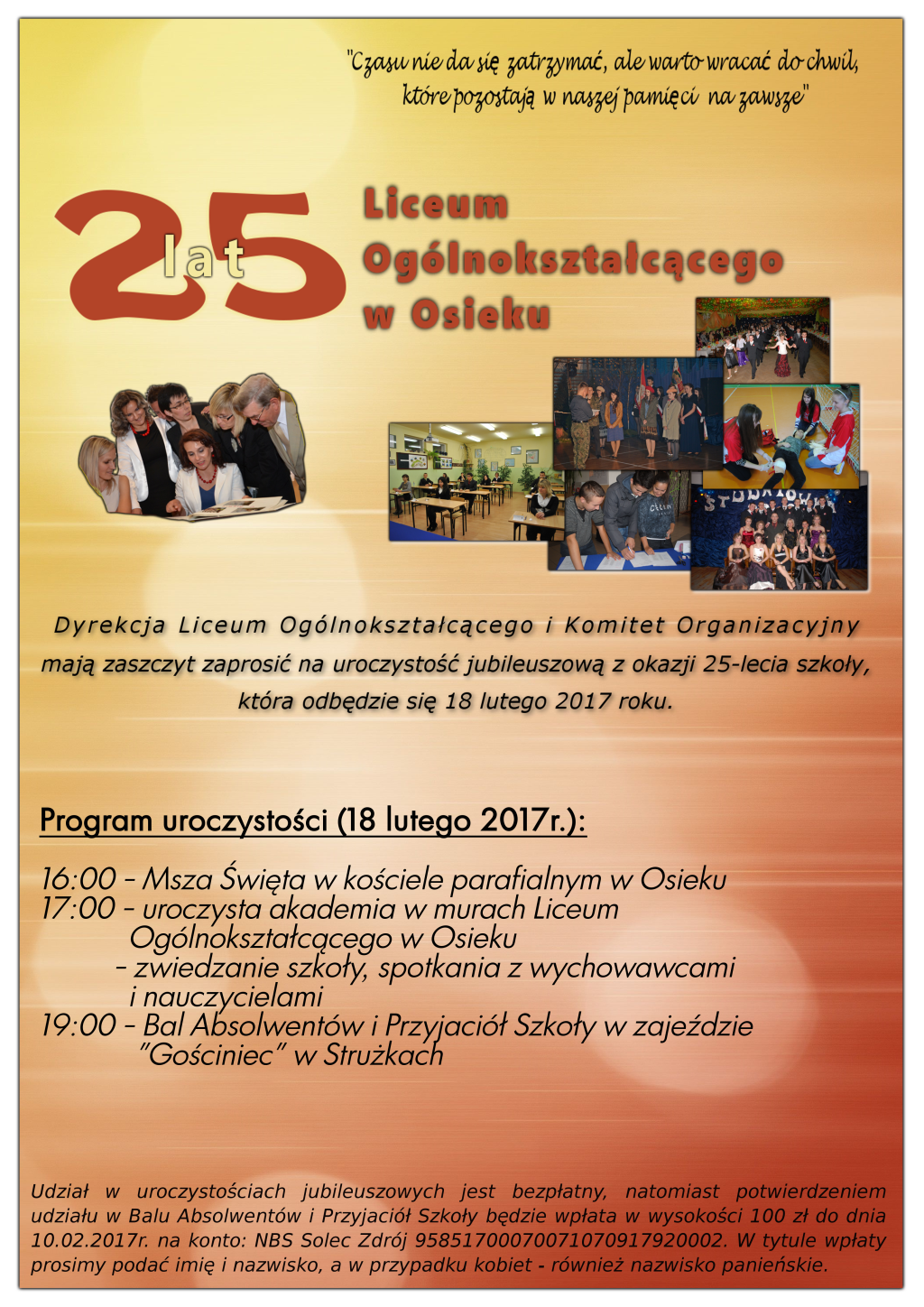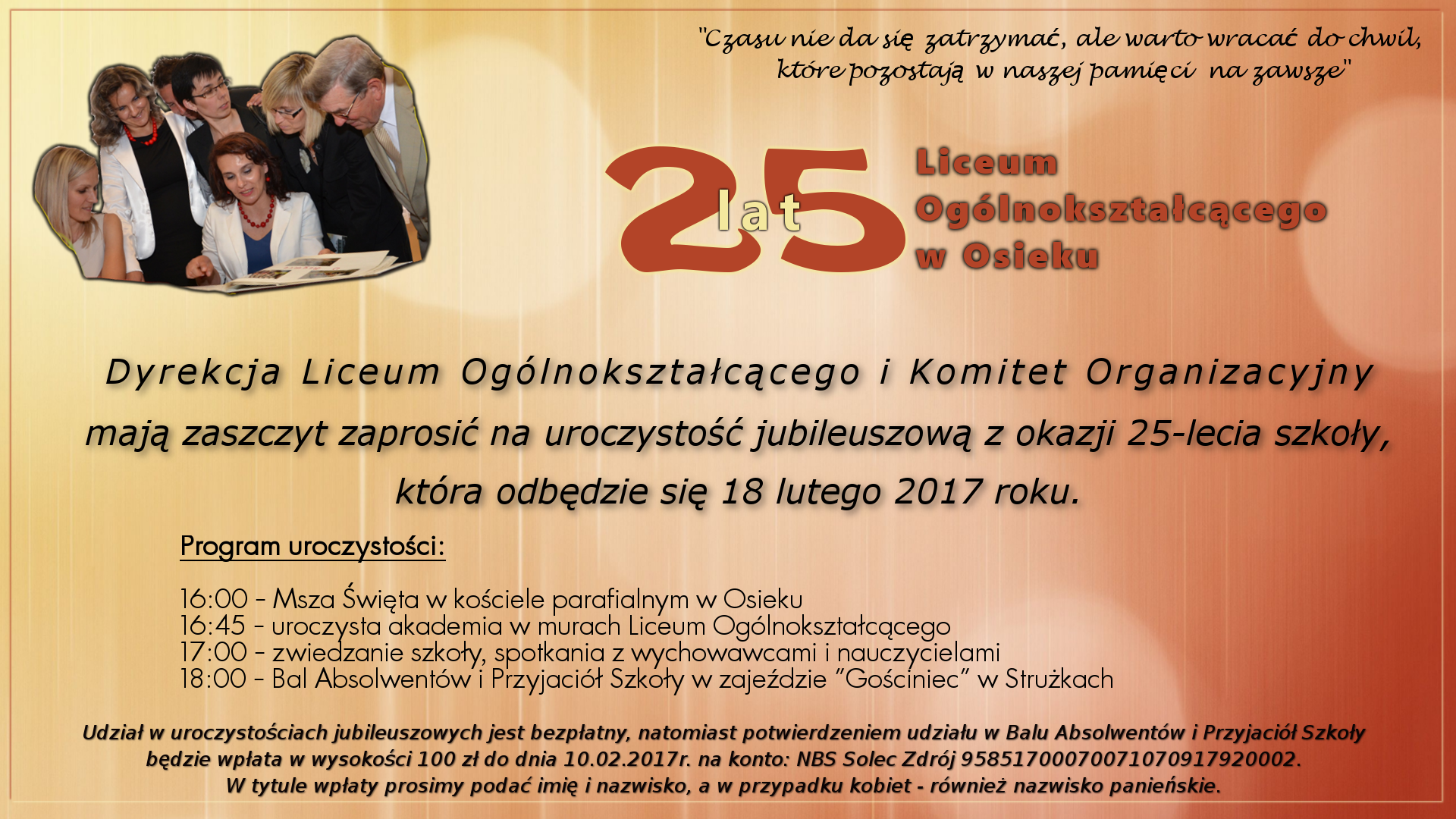 Drukuj Powrót do poprzedniej strony 25-lecie Liceum Ogólnokształcącego w Osieku 22.12.2016 16:38 Treść NBS Solec Zdrój 95851700070071070917920002