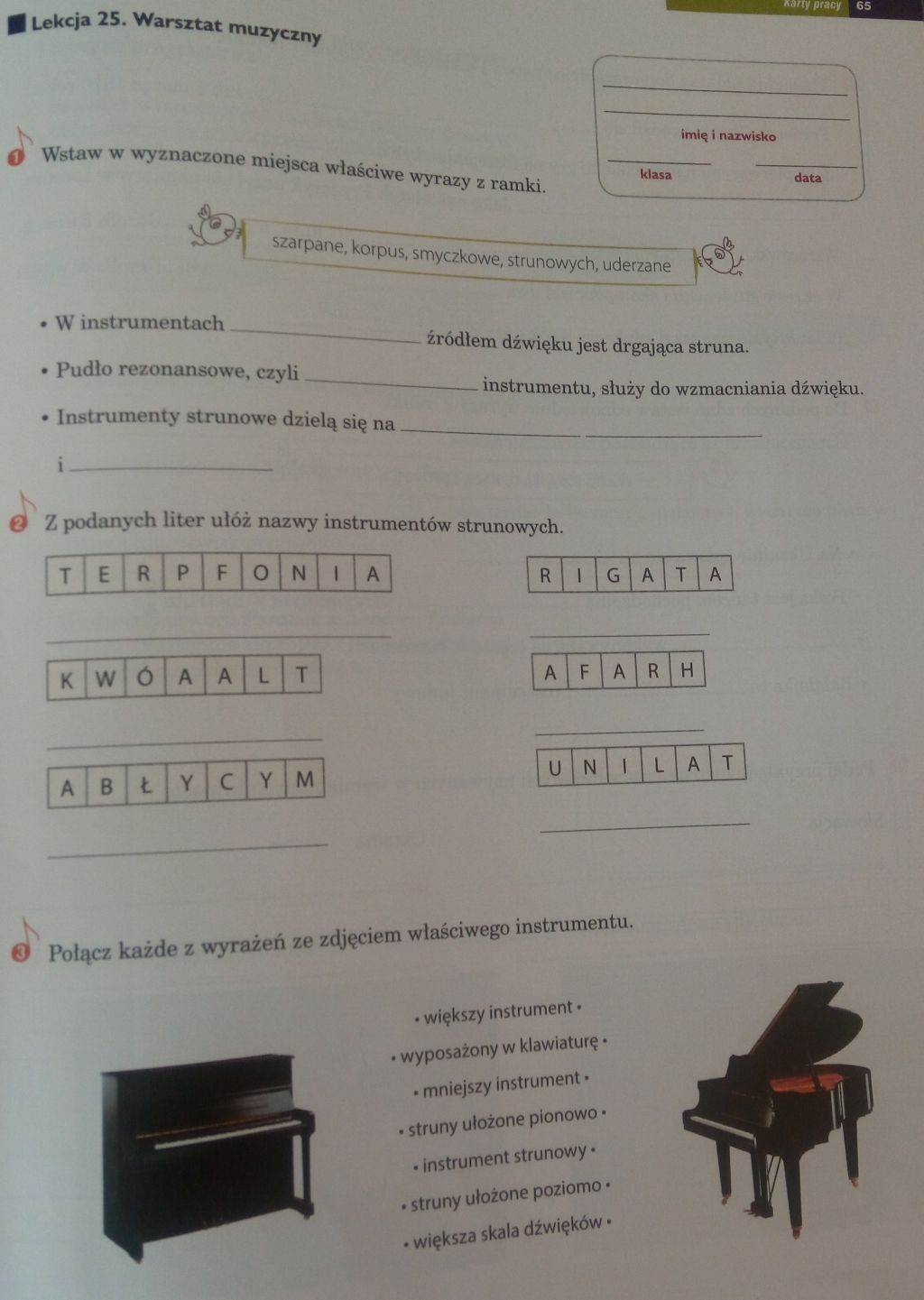 Z dołączonego zdjęcia karty (PLIK: „5a 31 III Warsztat muzyczny- powtórzenie.JPG”) pracy wykonaj zadanie 1 i 2 w zeszycie. Zdjęcie pracy wyślij na mojego e- maila (renatadurda@interia.pl), jeśli masz problem, napisz.