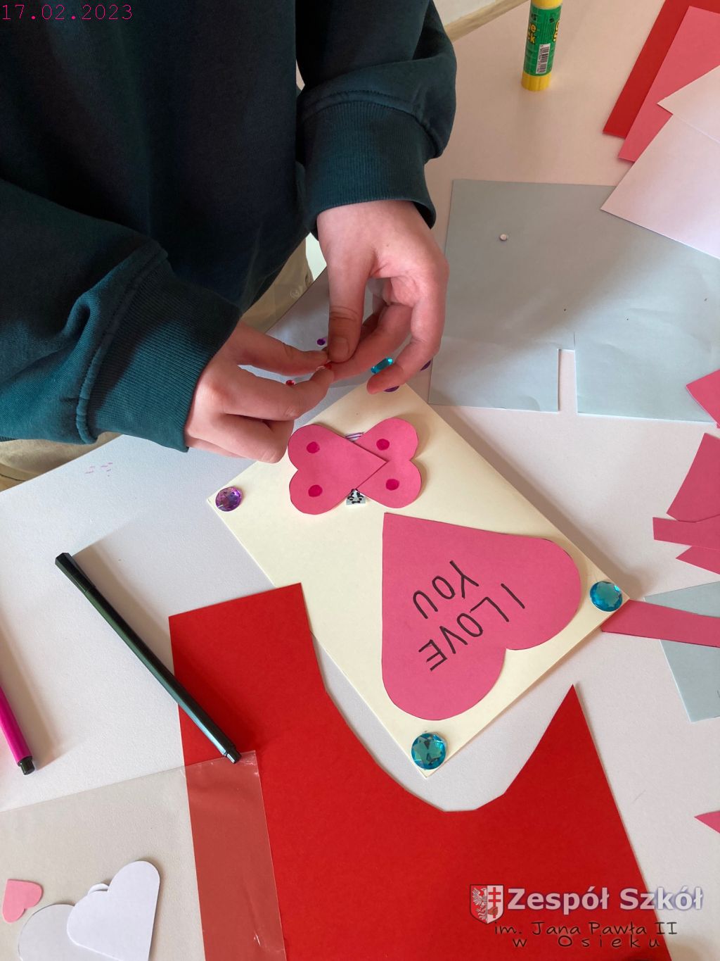 W gabinecie zajęć specjalistycznych odbyły się zajęcia rewalidacyjne z elementami sztuk plastycznych w ramach innowacji pedagogicznej „Usprawnianie przez kreatywne działanie”. Według własnego pomysłu uczestnicy zajęć wykonywali kartki walentynkowe. Do wykonania kartek posłużyły następujące pomoce: blok techniczny, papier kolorowy, flamastry, kredki, patyczki drewniane, ozdoby samoprzylepne, taśma dwustronna, klej, nożyczki.