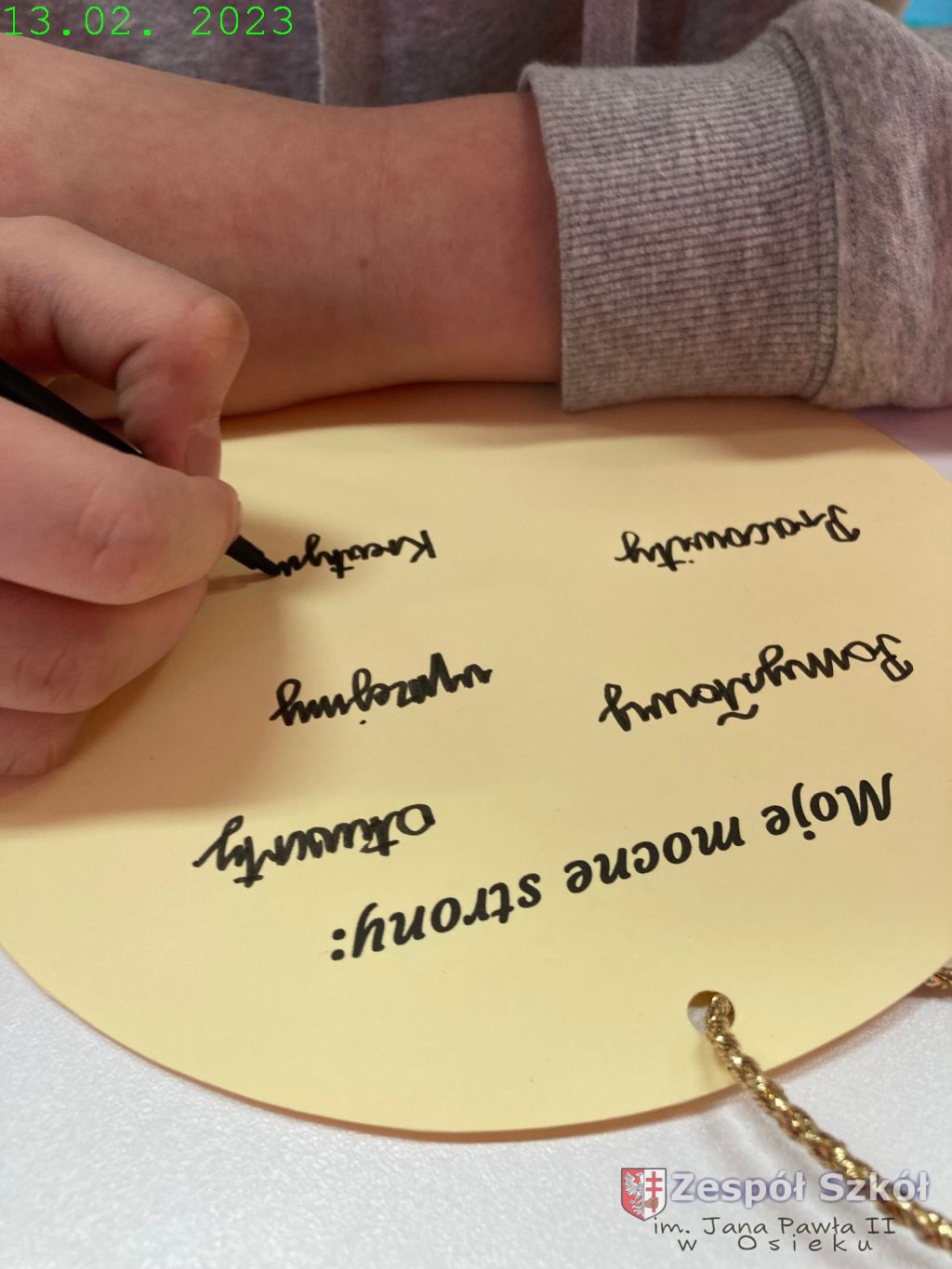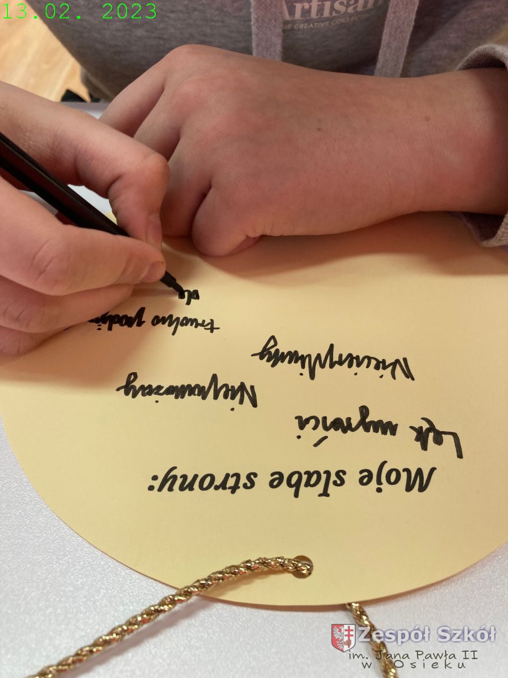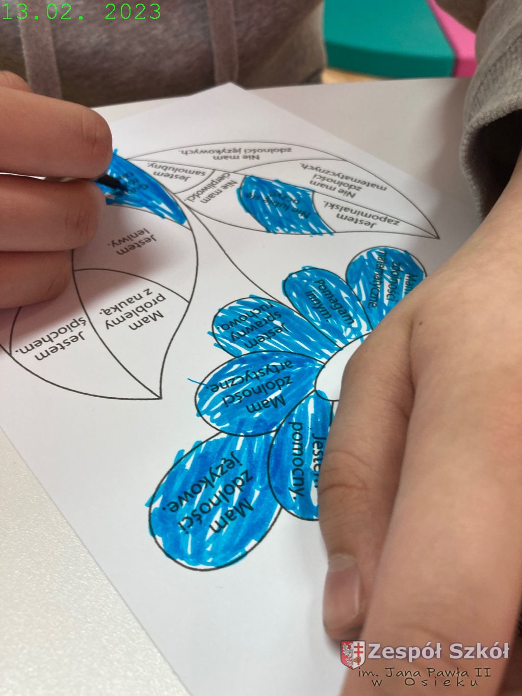 Opis zajęć: W gabinecie zajęć specjalistycznych odbyły się zajęcia rewalidacyjne, których głównym celem było rozwijanie poczucia własnej wartości. Uczestnicząc w zajęciach uczeń rozwijał ciekawość wobec własnej osoby, dążył do samopoznania, odkrywał swoje mocne i słabe strony, poznawał cechy innych osób, uczył się akceptacji wobec własnych ograniczeń i ograniczeń innych osób. Na zajęciach wykorzystane zostały następujące ćwiczenia: