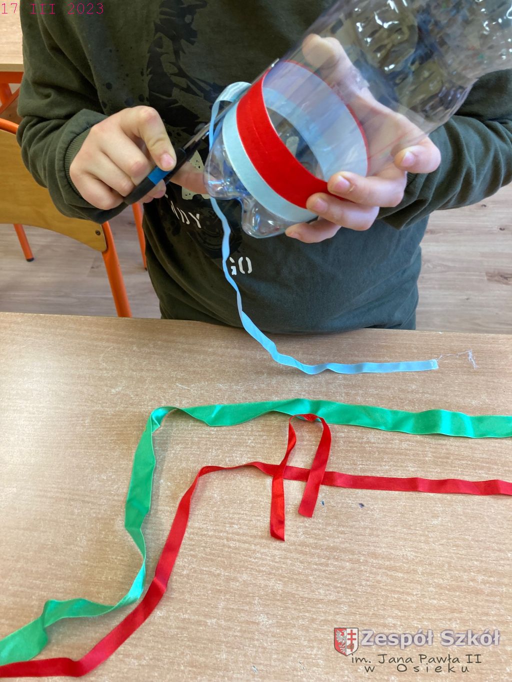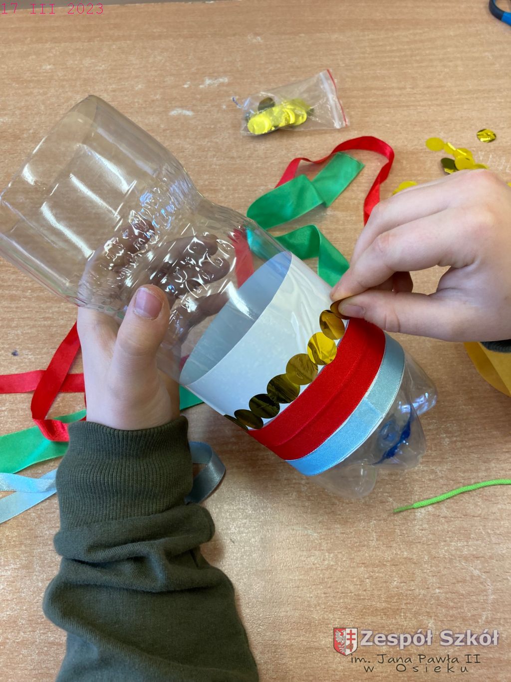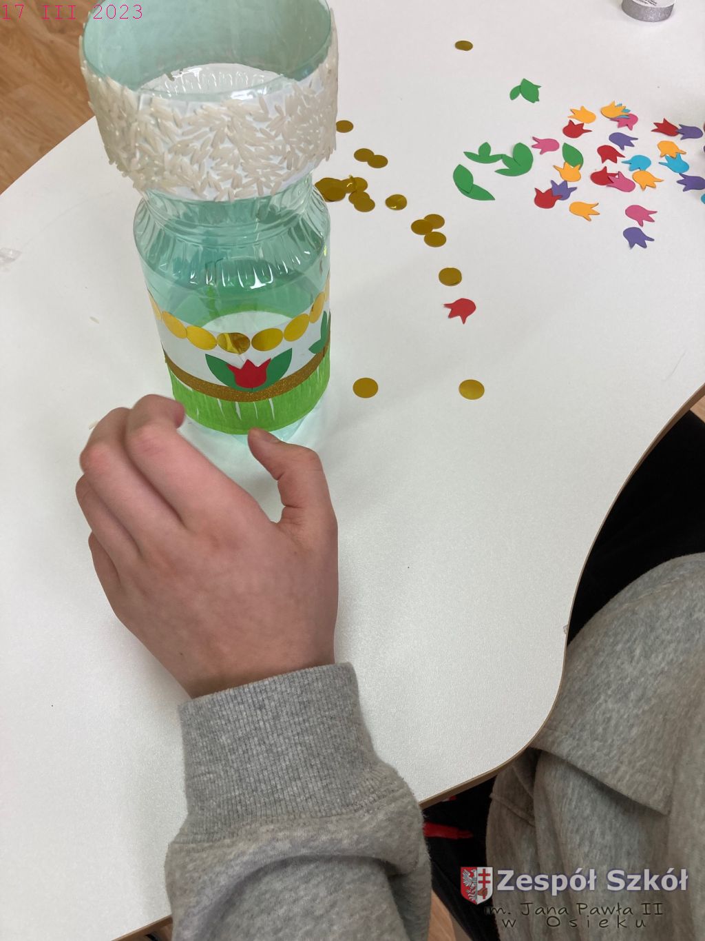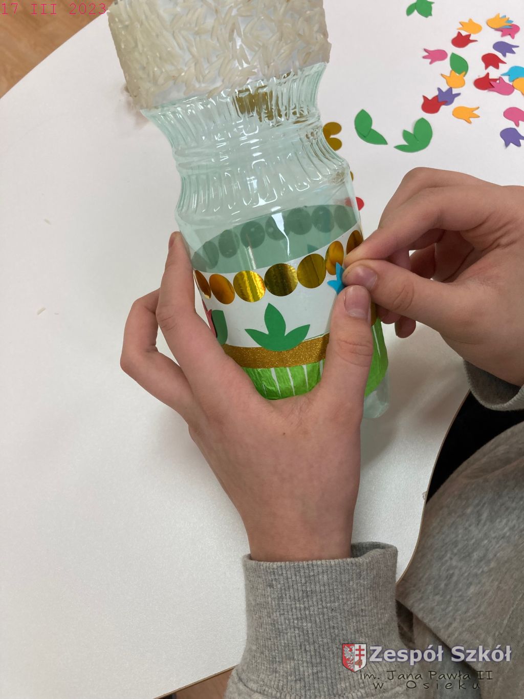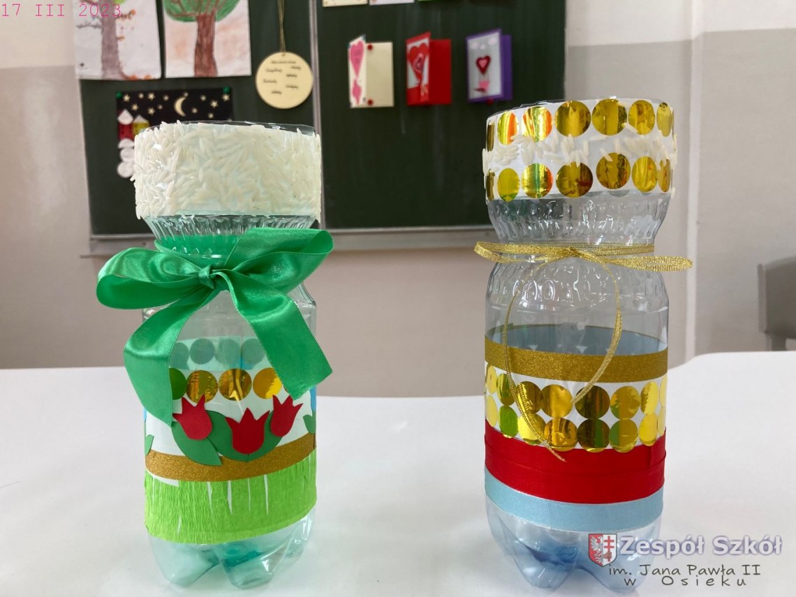 W gabinecie zajęć specjalistycznych odbyły się zajęcia rewalidacyjne z elementami sztuk plastycznych w ramach innowacji pedagogicznej „Usprawnianie przez kreatywne działanie”. Uczestnicy zajęć wykonywali fantazyjny wazon poprzez oklejanie plastikowego pojemnika różnymi materiałami. Wykonując swoją pracę uczniowie korzystali z następujących materiałów: butelki plastikowe, plastelina, nasiona, ziarna, tasiemki, ścinki tkanin, papier kolorowy, bibuła, klej, folia, taśma dwustronna, nożyczki.