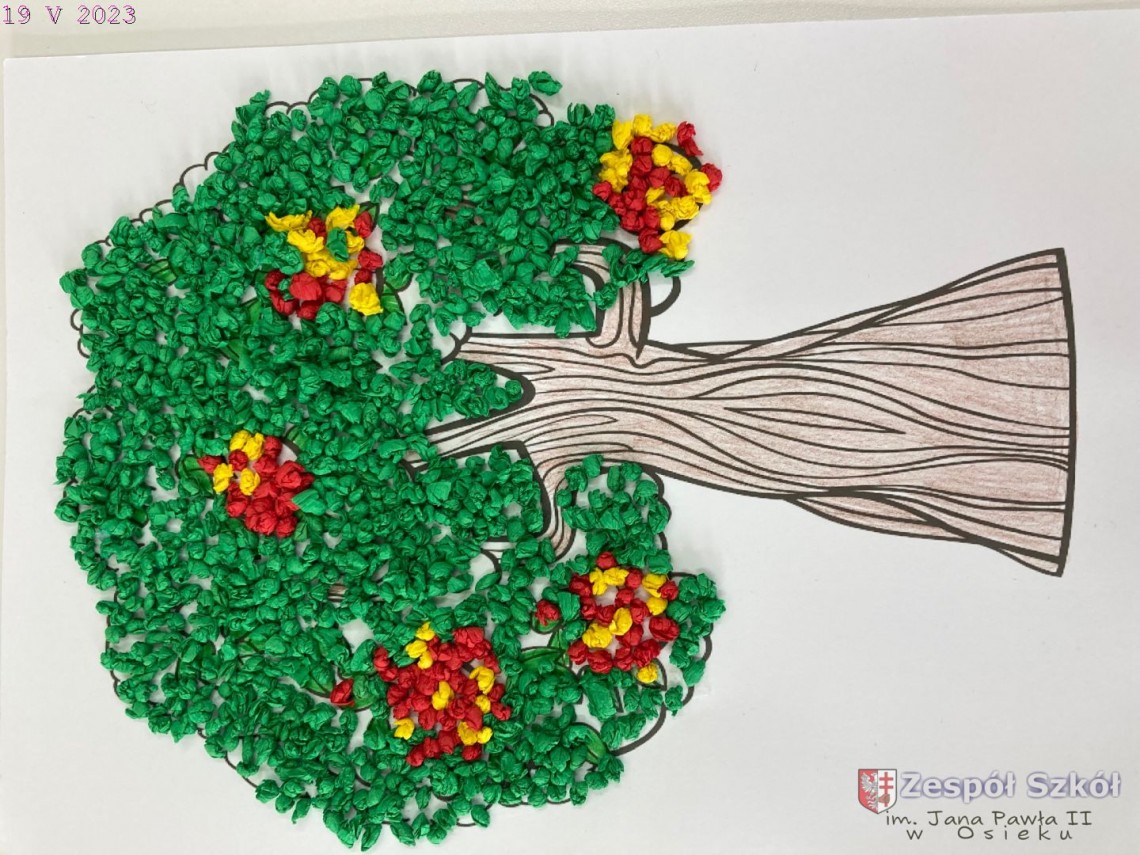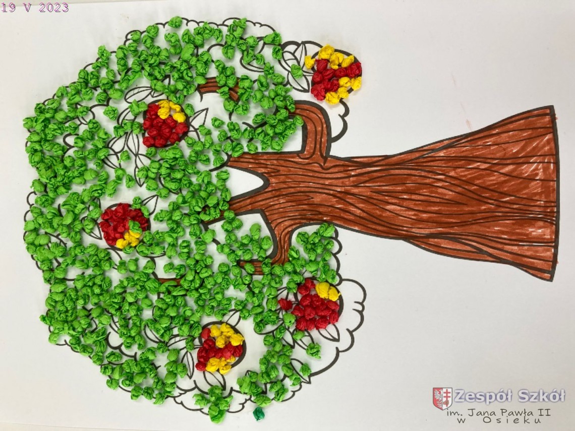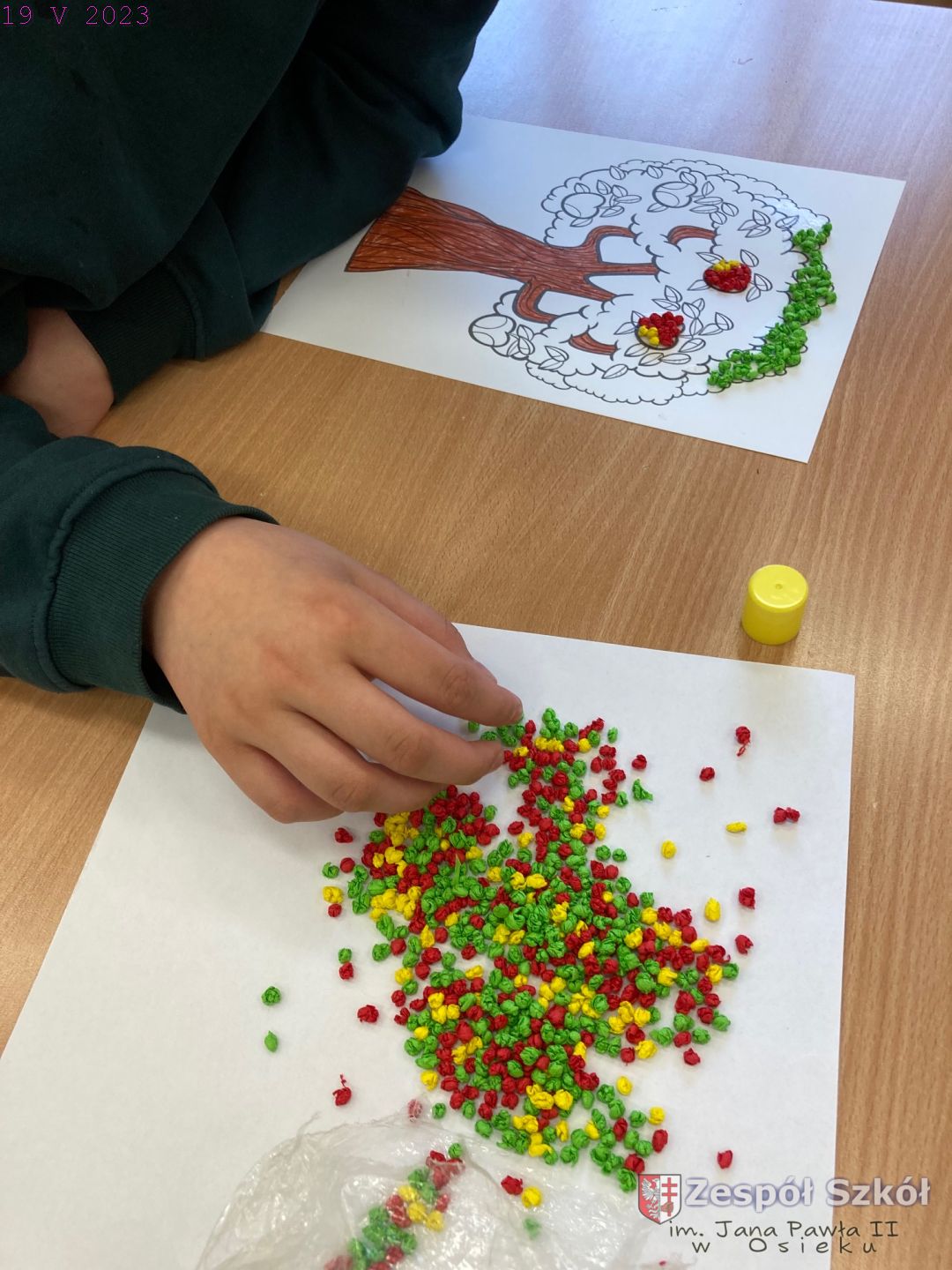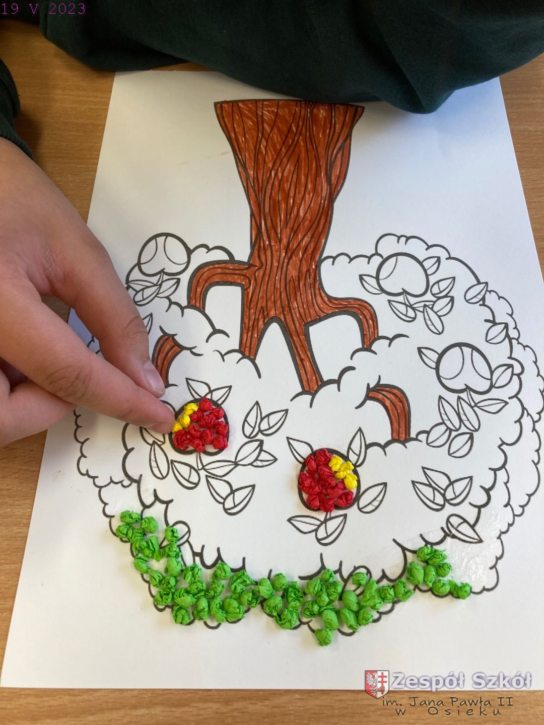 W gabinecie zajęć specjalistycznych odbyły się zajęcia rewalidacyjne z elementami sztuk plastycznych w ramach innowacji pedagogicznej „Usprawnianie przez kreatywne działanie”. Podczas zajęć uczniowie wykonywali plakat przedstawiający kwitnące drzewo. Praca polegała na wypełnieniu konturów obrazka kulkami wykonanymi z bibuły. Do wykonania drzewa posłużyły następujące pomoce: kartki z bloku technicznego z konturem drzewa, kolorowa bibuła, kredki, klej, nożyczki.