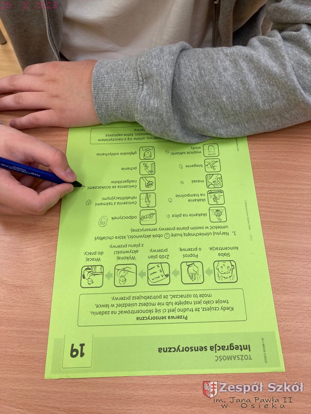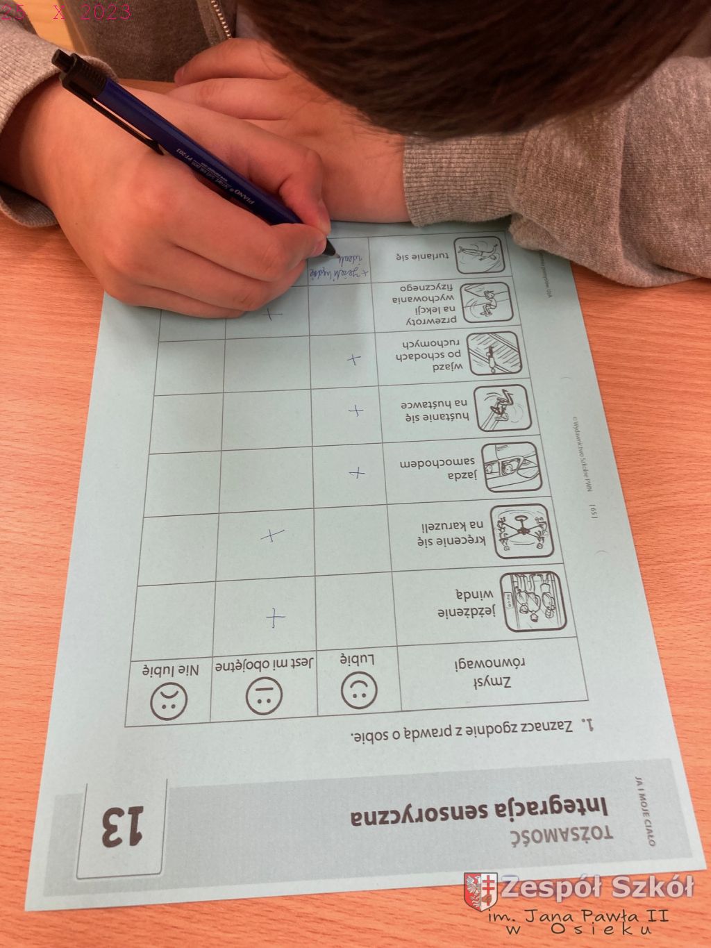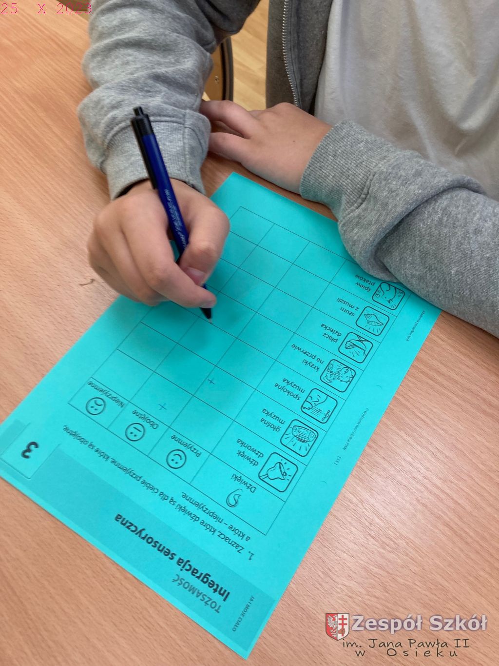 W gabinecie zajęć specjalistycznych odbyły się zajęcia rewalidacyjne, których głównym celem było rozwijanie umiejętności prawidłowego odbierania i interpretowania bodźców oraz informacji dostarczanych z otoczenia i z własnego ciała poprzez zmysły, wspieranie ucznia w dążeniu do samopoznania, stymulowanie komunikacji werbalnej.
