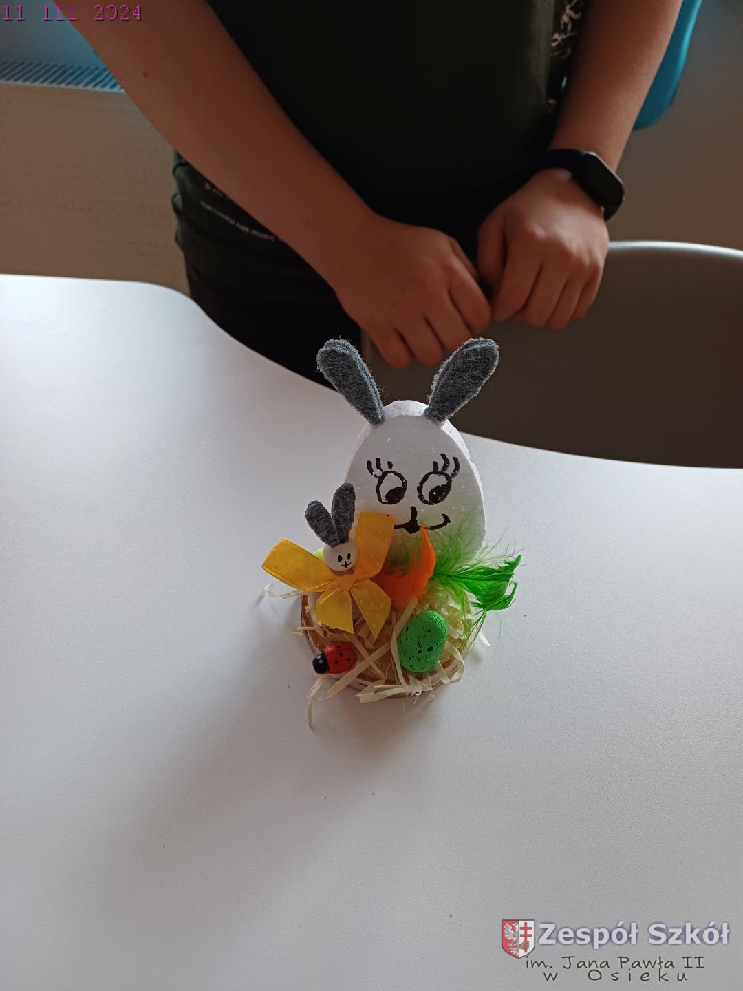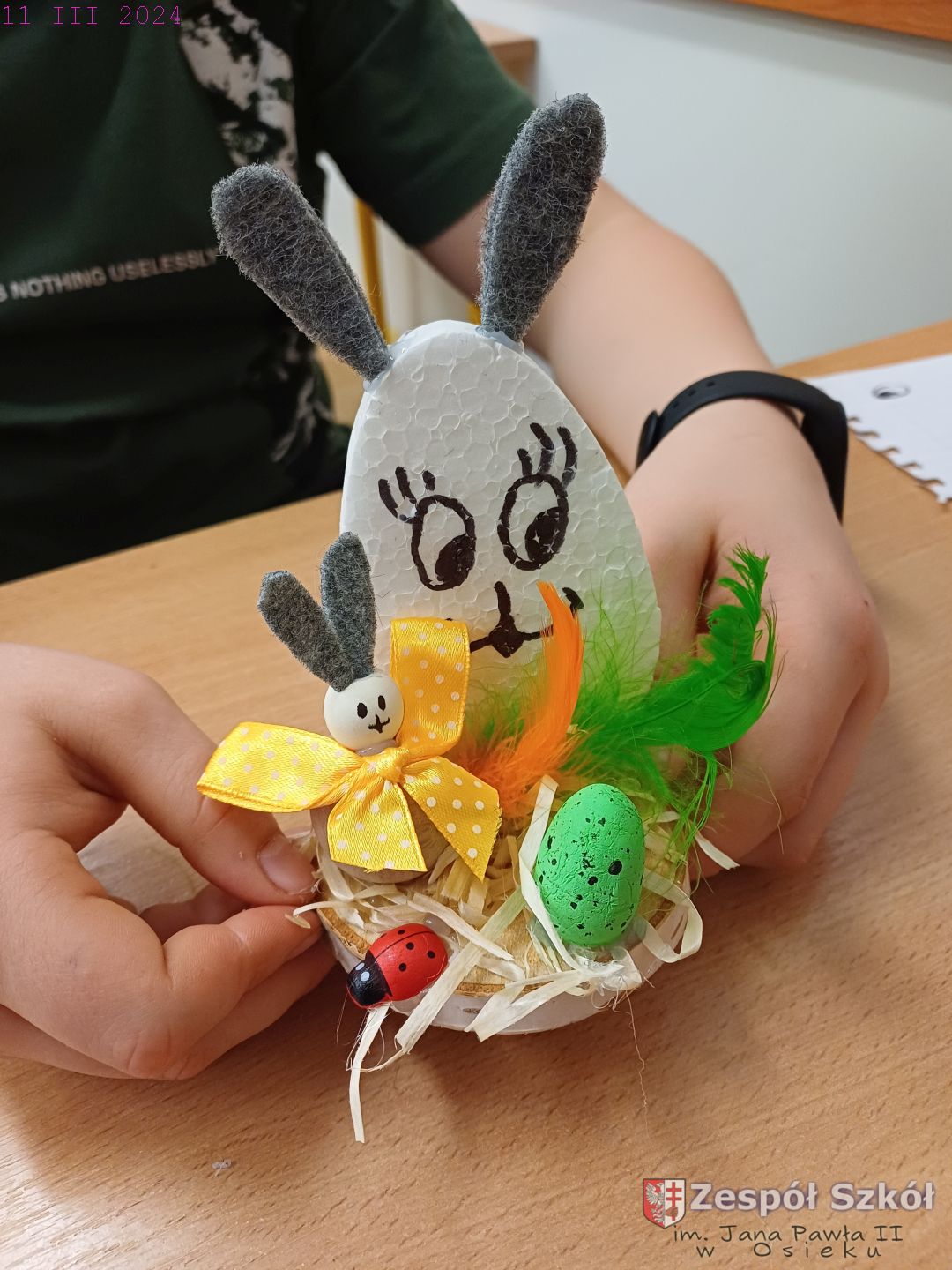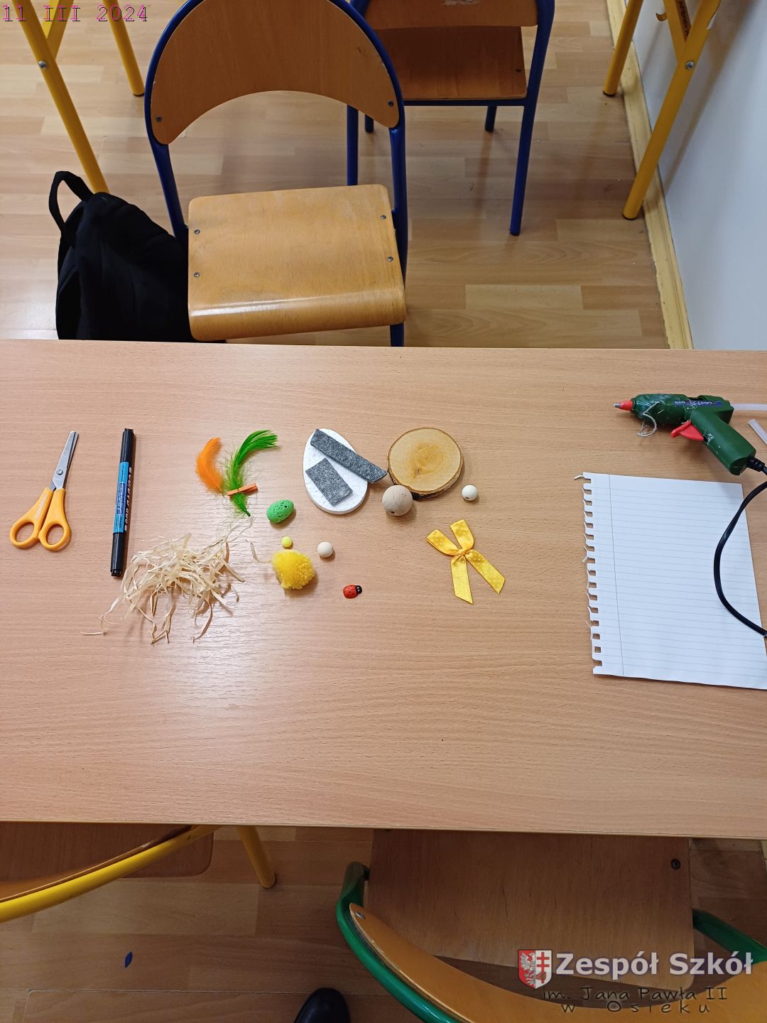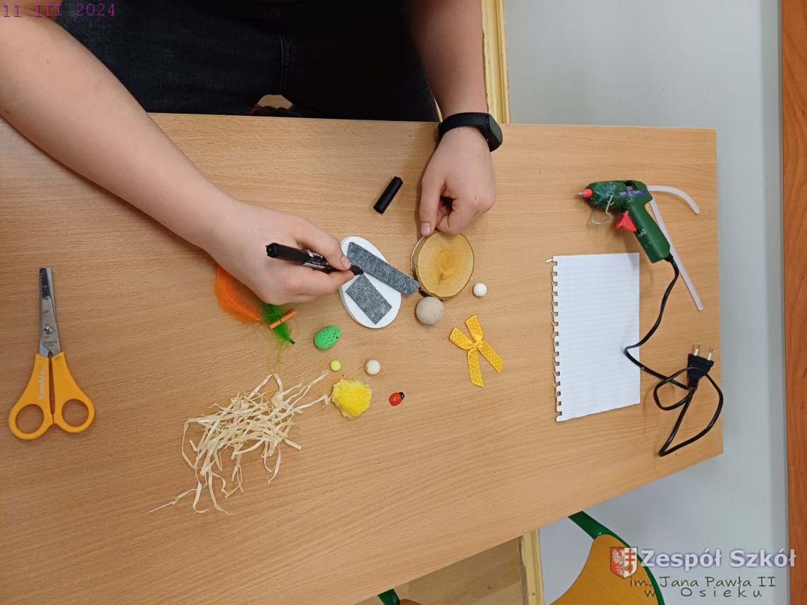 W gabinecie zajęć specjalistycznych przeprowadzone zostały zajęcia rewalidacyjne z elementami sztuk plastycznych. Uczeń na zajęciach wykonywał stroik świąteczny według własnego pomysłu dowolną techniką. Do wykonania stroika wykorzystane zostały następujące pomoce: plaster drewna, klej na gorąco, kulki drewniane , elementy styropianowe - jajka, filc, kolorowe piórka . Uczeń pracował z chęcią i zaangażowaniem. Wkładał dużo wysiłku w staranne i estetyczne wykonanie swojej pracy. Podczas zajęć panowała przyjemna, świąteczna atmosfera.