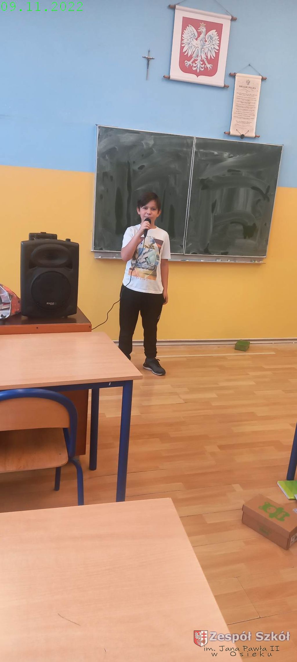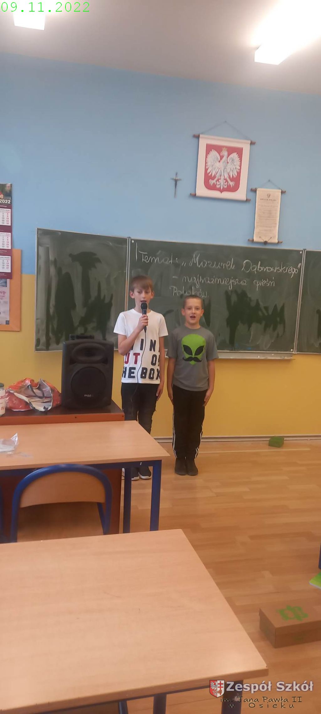 Opis zajęć: Celem zajęć było przypomnienie i utrwalenie hymnu narodowego oraz zapoznanie się z okolicznościami powstania pieśni. W tym celu wykorzystano nagłośnienie/mikrofon. Uczniowie chętnie śpiewali ”Mazurek Dąbrowskiego” z wykorzystaniem tej pomocy.