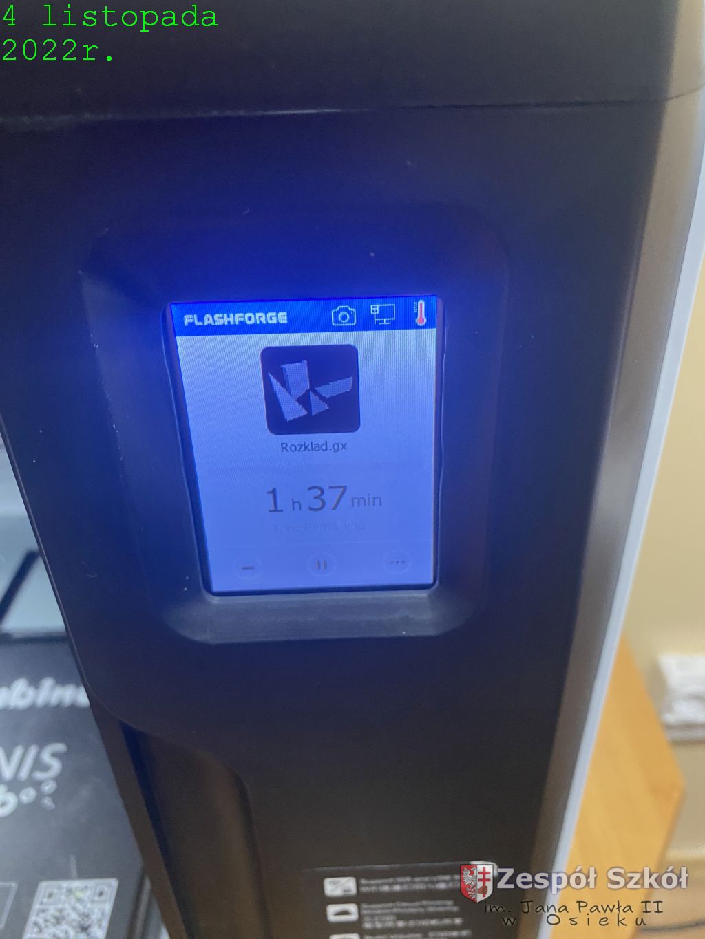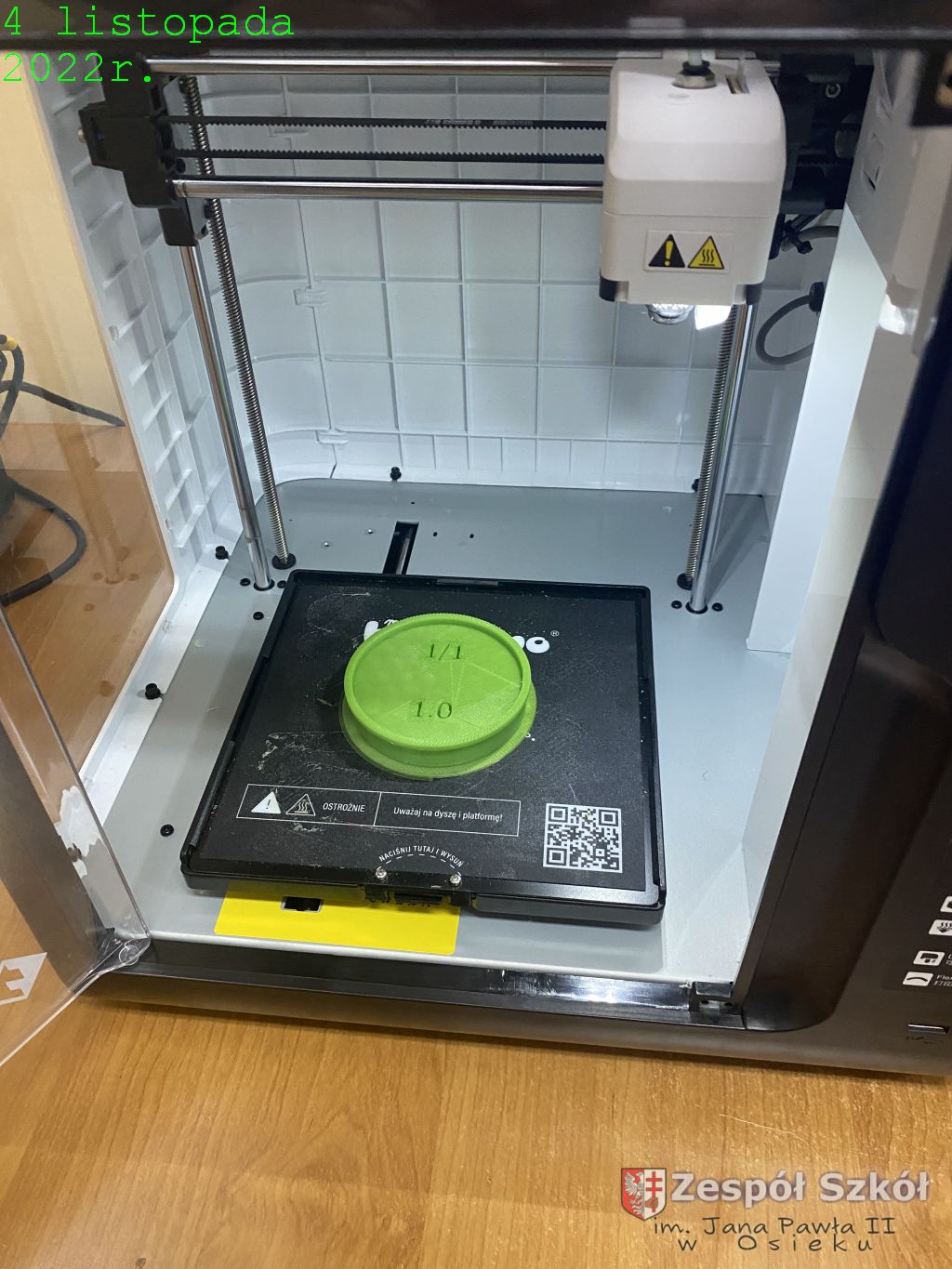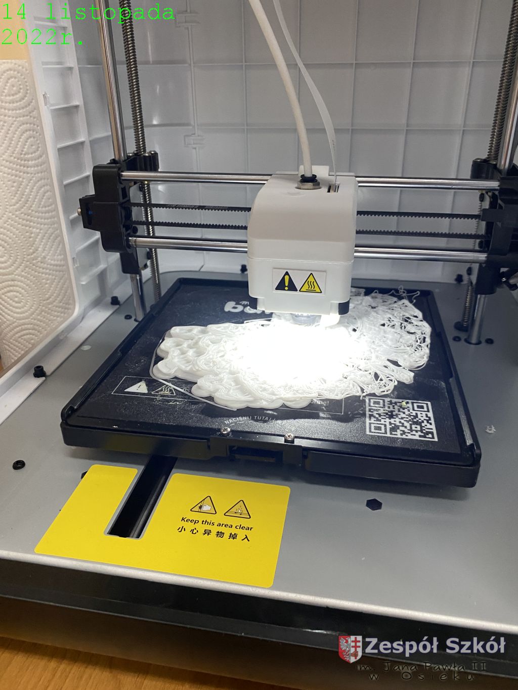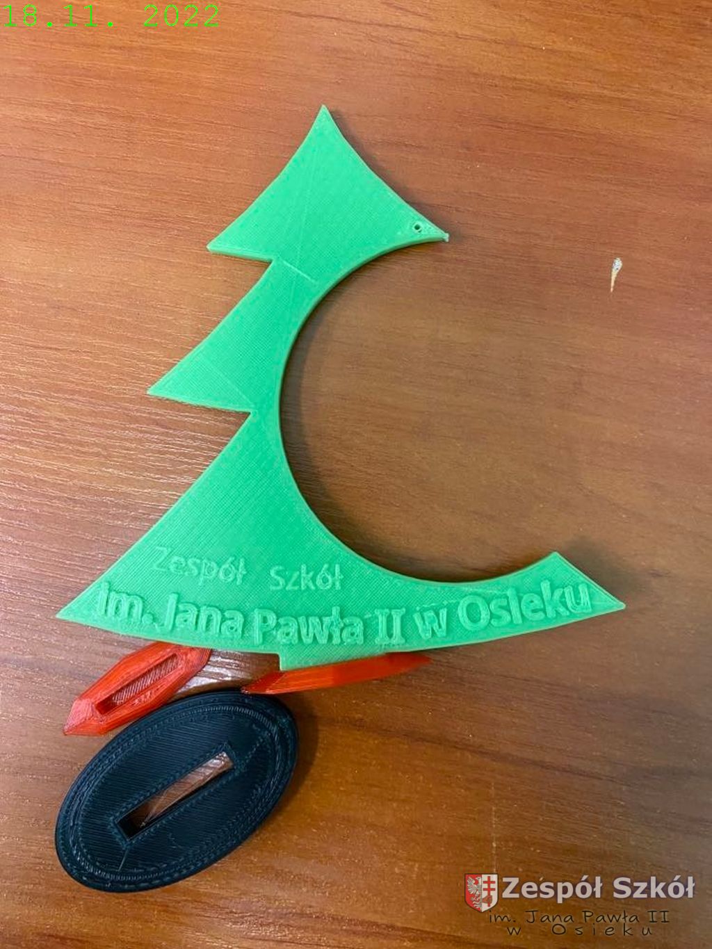 Opis zajęć: Wraz z siedmioma chętnymi uczniami z klasy 7 i 8a postanowiliśmy stworzyć małe podarunki dla zaproszonych gości, którzy zaszczycą nas swoją obecnością podczas otwarcia pracowni w ramach Laboratoriów Przyszłości. Nasz wybór padł na zaprojektowanie choinki z nazwą naszej szkoły i jej wydruk na drukarce 3D. Po kilku próbach wydruku choinki oraz stojaka, wybraliśmy model (stworzony przez uczniów w programie TinkerCad).