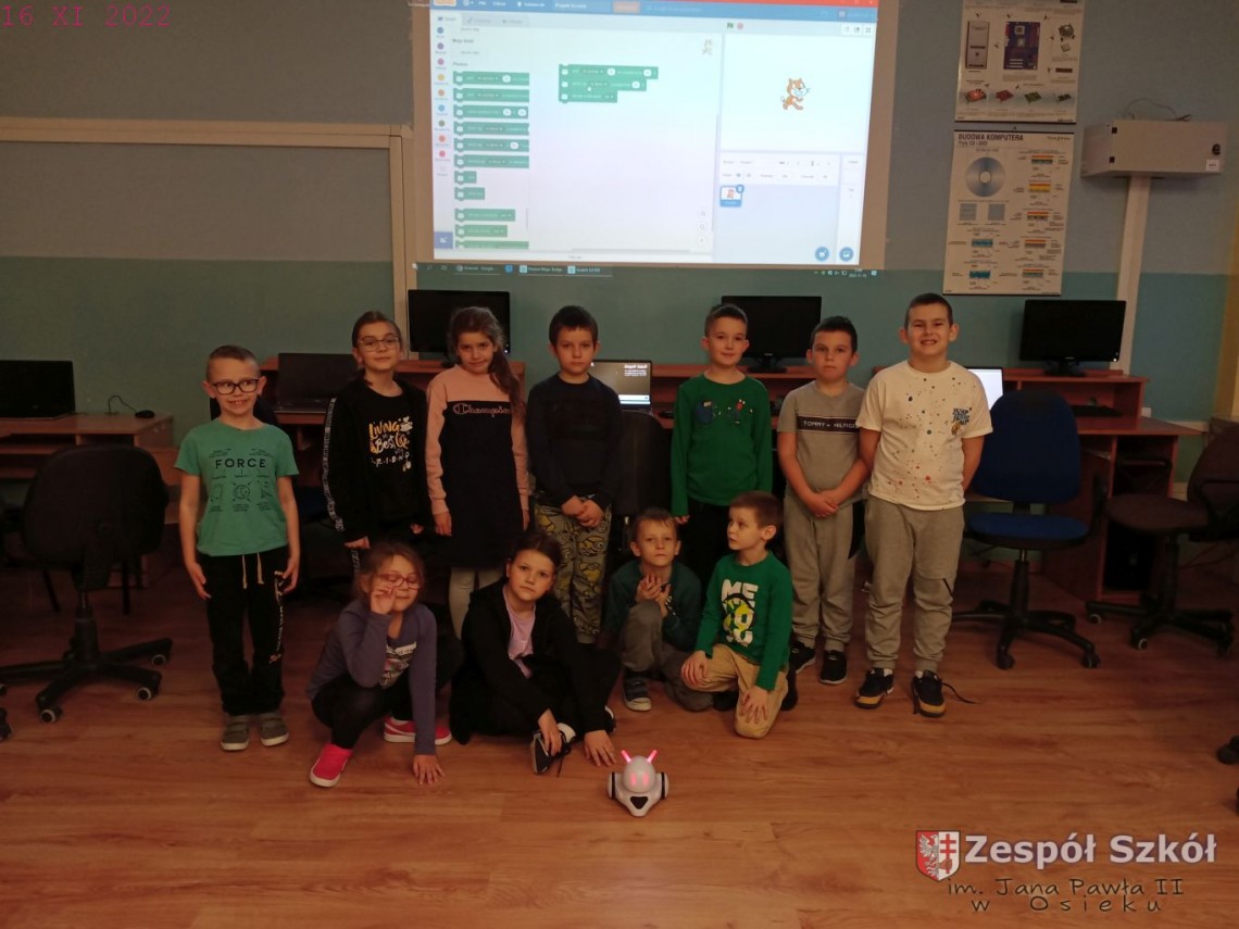 Opis zajęć: Uczniowie z klasy II b powoli wkraczają w świat programowania i poznają jego tajemnice w programie Scratch. Na lekcję zawitał do nich robot Photon. Uczniowie próbowali programować stosując wybrane bloki w programie pozwalające poruszać się robotowi, wydawać dźwięki i zmieniać kolor oczu i czułek. Wszyscy byli bardzo zadowoleni ze spotkania z robotem i pełni wrażeń.