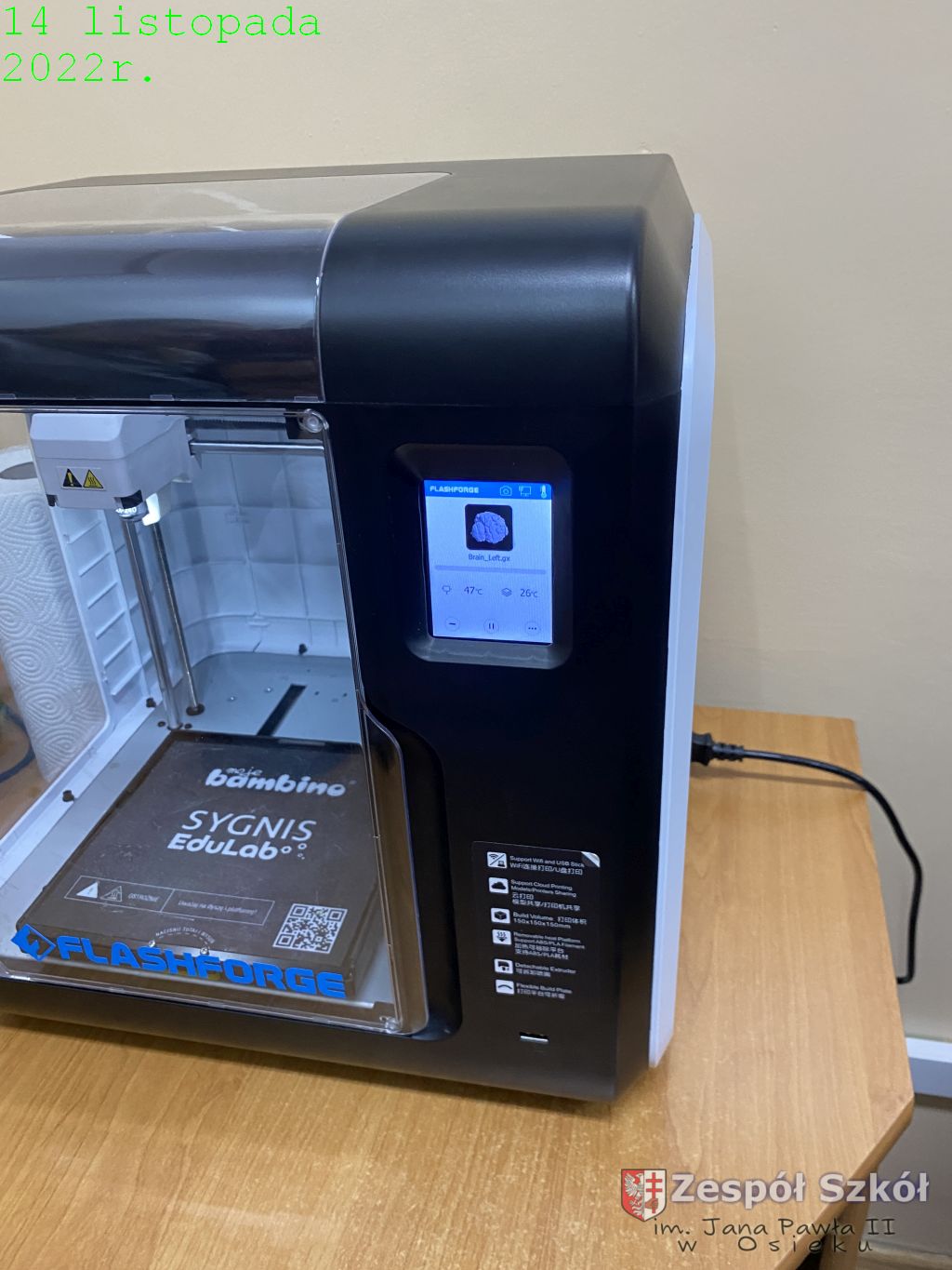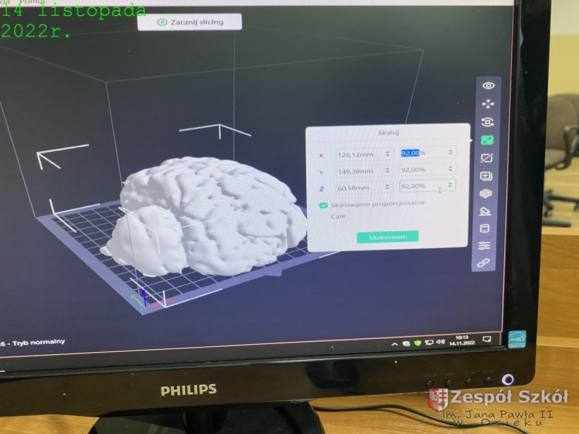 Opis zajęć: Uczniowie z klasy VII zapoznali się ze stroną www.thingiverse.com. Przeszukali zasoby serwisu w poszukiwaniu przydatnych pomocy na lekcje biologii. Wybór padł na duży model mózgu (dwa wydruki)). Po akceptacji wyboru przez klasę, wyborze koloru filamentu (biały) zaczęliśmy druk. Po kilkudziesięciu godzinach efekty były co najmniej zadowalające.
