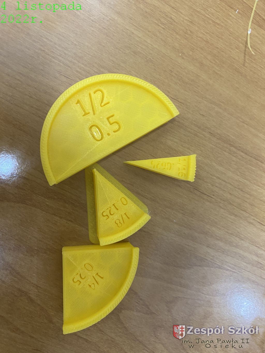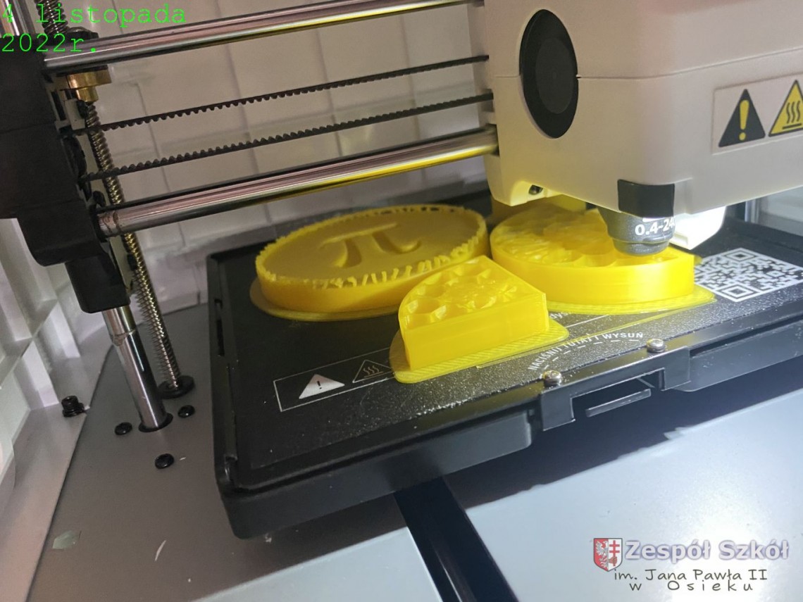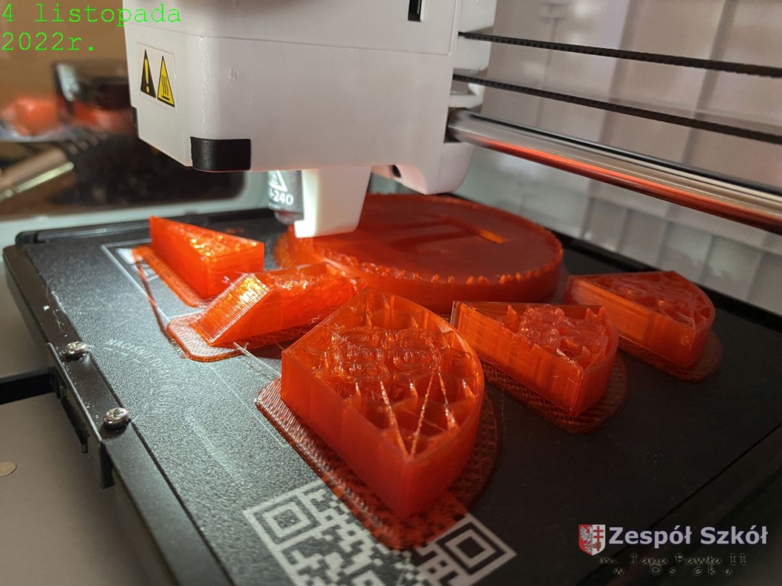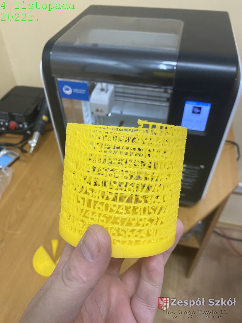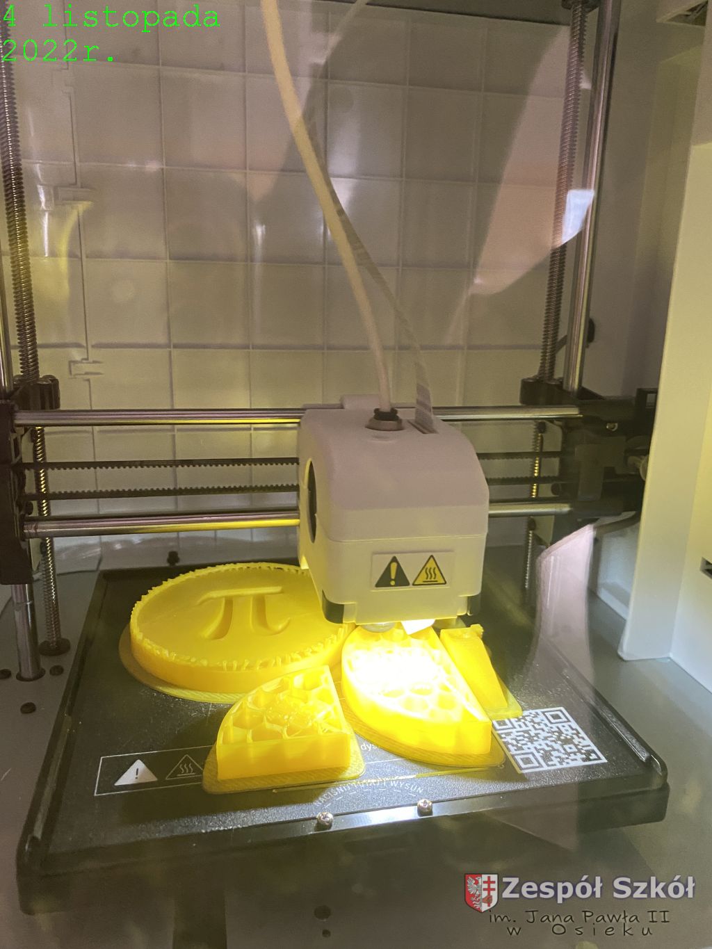 Opis zajęć: Chętnych uczniów z klasy VI zapoznaliśmy (wraz z praktykantem Filipem) ze stroną www.thingiverse.com. Gabrysia, Klaudia, Weronika, Wiktoria oraz Patryk i Wiktor przeszukały zasoby serwisu w poszukiwaniu przydatnych pomocy na lekcje matematyki. Wybór padł na przybornik na organizer na przybory zbudowany z cyfr tworzących liczbę PI, pomoc w nauce ułamków (podział całości) oraz modele ostrosłupów). Po akceptacji wyboru przez grupę, wyborze koloru filamentów zaczęliśmy druk pomocy matematycznych. Po kilku dniach efekty były co najmniej zadowalające.