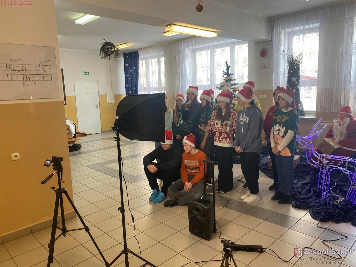 Opis zajęć: Chętni uczniowie z klasy szóstej w przededniu magicznych świąt Bożego Narodzenia nagrali piosenkę świąteczną pt. „ Jingle bells”. Była to okazja do świetnej zabawy oraz wykorzystania sprzętu zakupionego w ramach programu „Laboratoria przyszłości”: system nagłośnieniowy Ibiza PORT 12VHF-BT, Zoom H1/IF Dyktafon Cyfrowy, lampa doświetlająca, statywy, aparat Canon PowerShot G7X Mark III.
