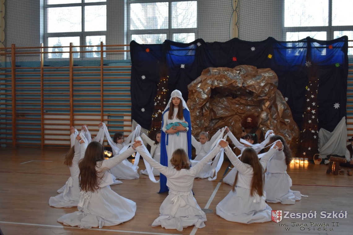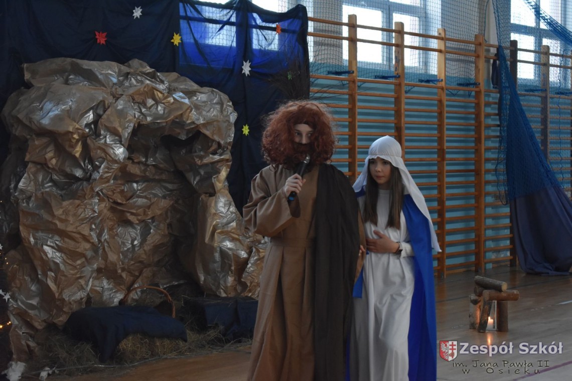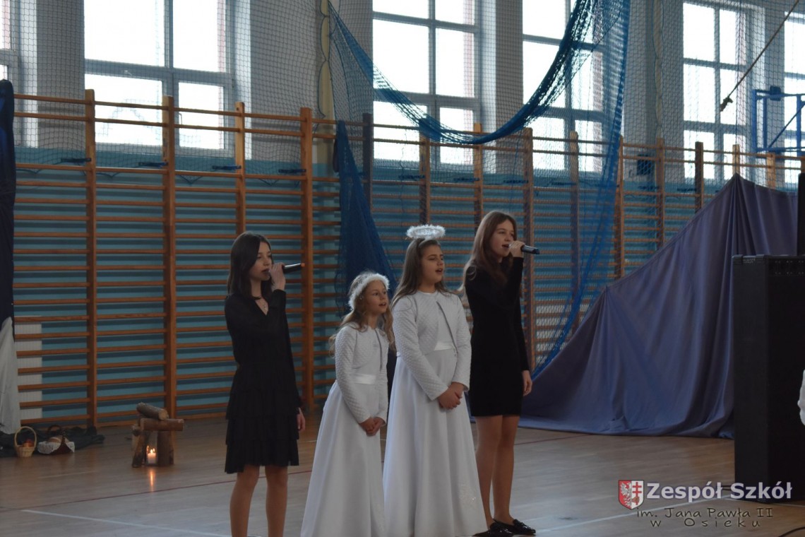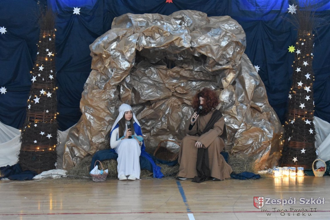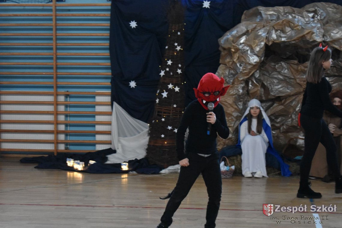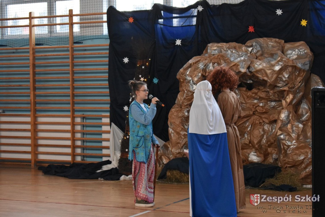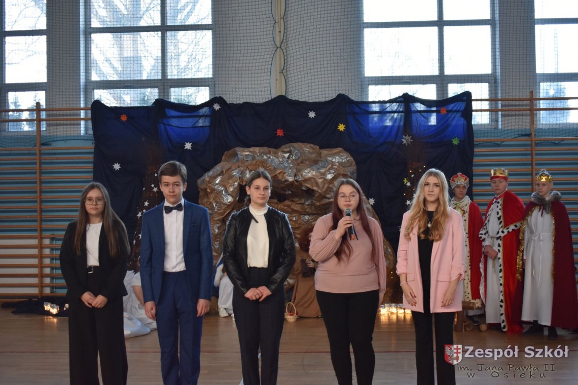 W klimacie nadchodzących Świąt Bożego Narodzenia i blasku choinkowych świec 22 grudnia 2022 roku w naszej szkole zostały wystawione Jasełka Bożonarodzeniowe. Biblijne wydarzenia sprzed 2000 lat odtworzyli uczniowie Zespołu Szkół im. Jana Pawła II w Osieku. Rozważając tajemnicę Bożego Narodzenia zostaliśmy przeniesieni myślą i sercem do Ziemi Świętej snując głębokie refleksje nad ,,Cudem Świętej Nocy’’, gdzie w ubogiej stajence narodził się Jezus. Piękna scenografia wprowadziła zgromadzoną publiczność w świąteczny nastrój, a młodzi aktorzy przedstawili sceny narodzin Chrystusa. O piękne przeżycia i miłe doznania słuchowe zadbali zdolni aktorzy i wokaliści naszej szkoły. Uczniowie mieli możliwość uczestniczenia w tradycji, a także zaprezentowania swoich umiejętności artystycznych. Przedstawienie jasełkowe było dla nas wszystkich lekcją wzajemnego zbliżenia, miłości, zadumy i refleksji.