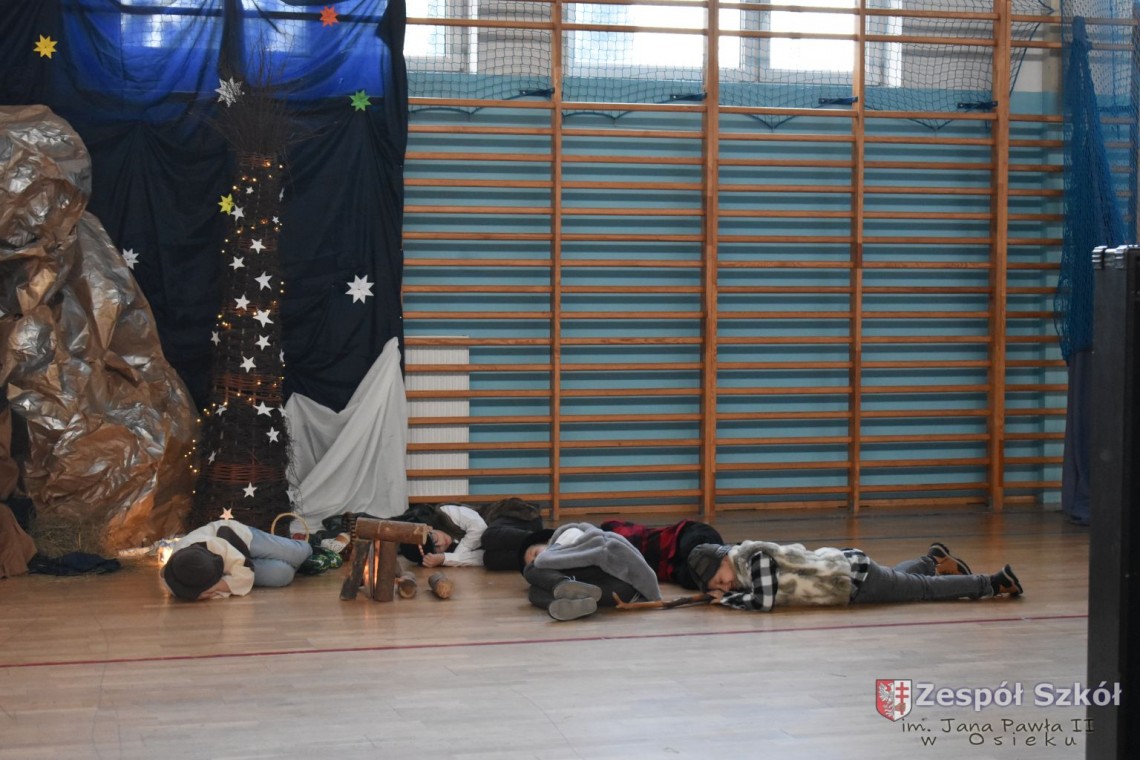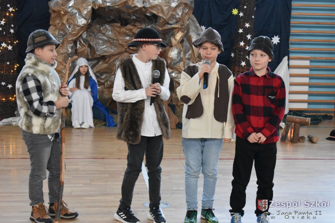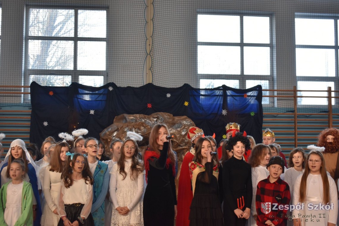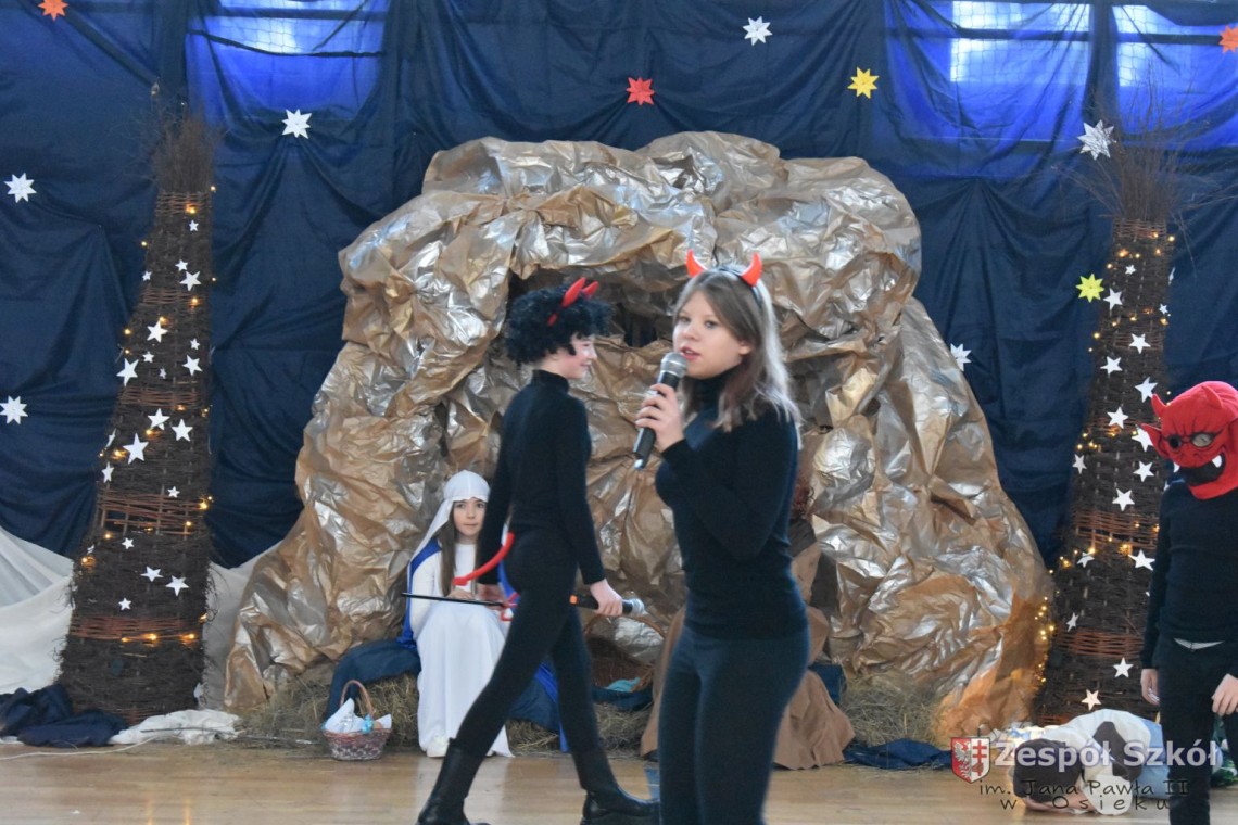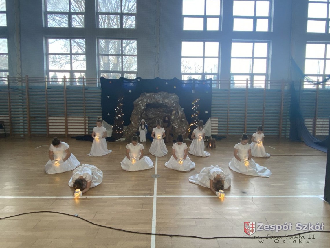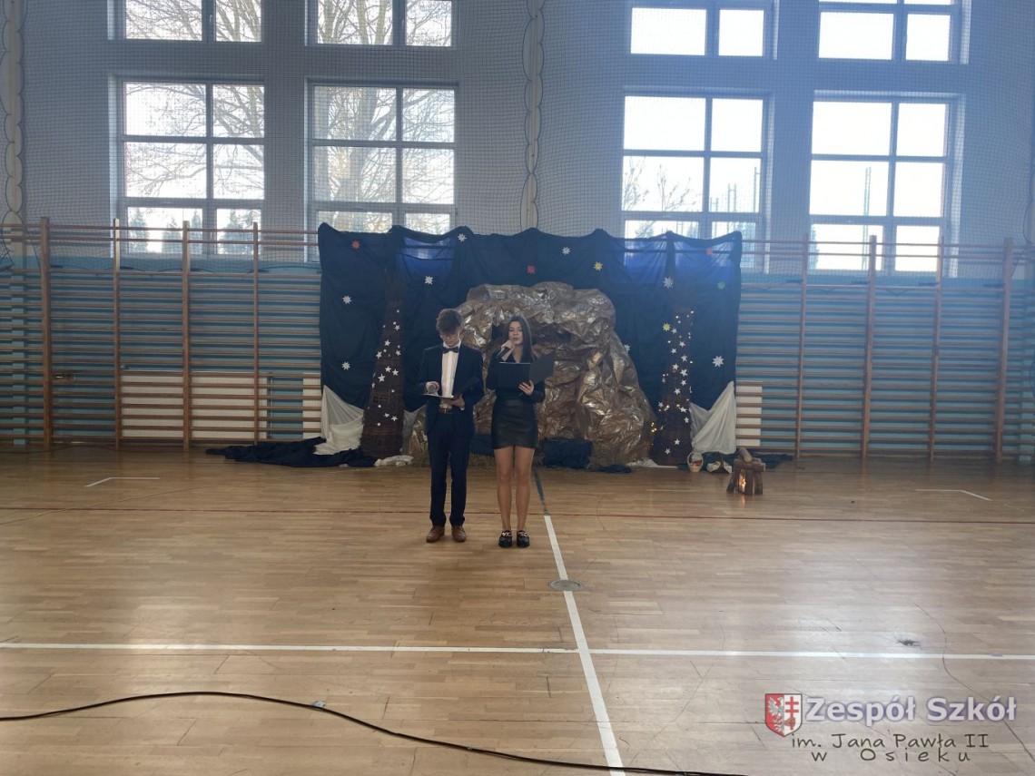 W klimacie nadchodzących Świąt Bożego Narodzenia i blasku choinkowych świec 22 grudnia 2022 roku w naszej szkole zostały wystawione Jasełka Bożonarodzeniowe. Biblijne wydarzenia sprzed 2000 lat odtworzyli uczniowie Zespołu Szkół im. Jana Pawła II w Osieku. Rozważając tajemnicę Bożego Narodzenia zostaliśmy przeniesieni myślą i sercem do Ziemi Świętej snując głębokie refleksje nad ,,Cudem Świętej Nocy’’, gdzie w ubogiej stajence narodził się Jezus. Piękna scenografia wprowadziła zgromadzoną publiczność w świąteczny nastrój, a młodzi aktorzy przedstawili sceny narodzin Chrystusa. O piękne przeżycia i miłe doznania słuchowe zadbali zdolni aktorzy i wokaliści naszej szkoły. Uczniowie mieli możliwość uczestniczenia w tradycji, a także zaprezentowania swoich umiejętności artystycznych. Przedstawienie jasełkowe było dla nas wszystkich lekcją wzajemnego zbliżenia, miłości, zadumy i refleksji.