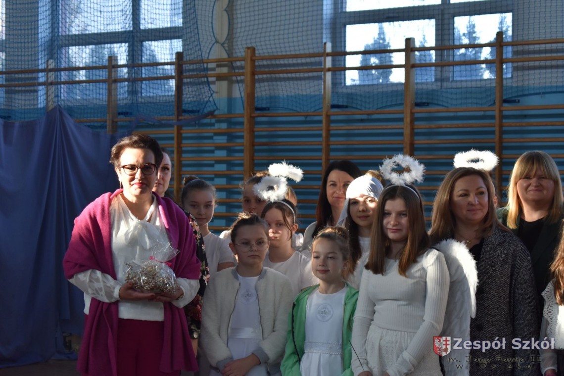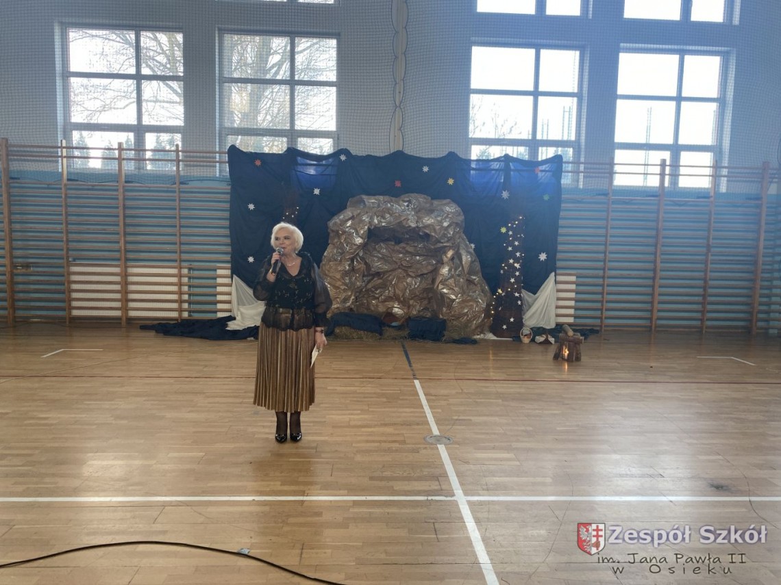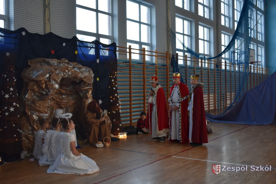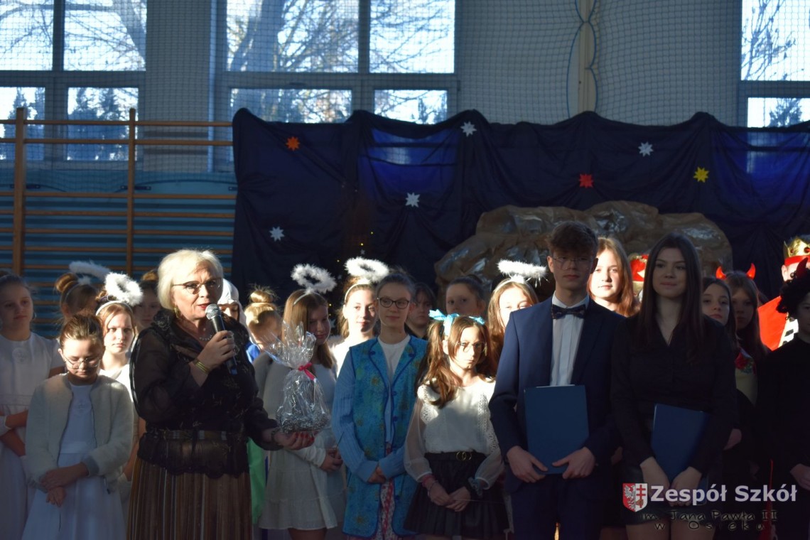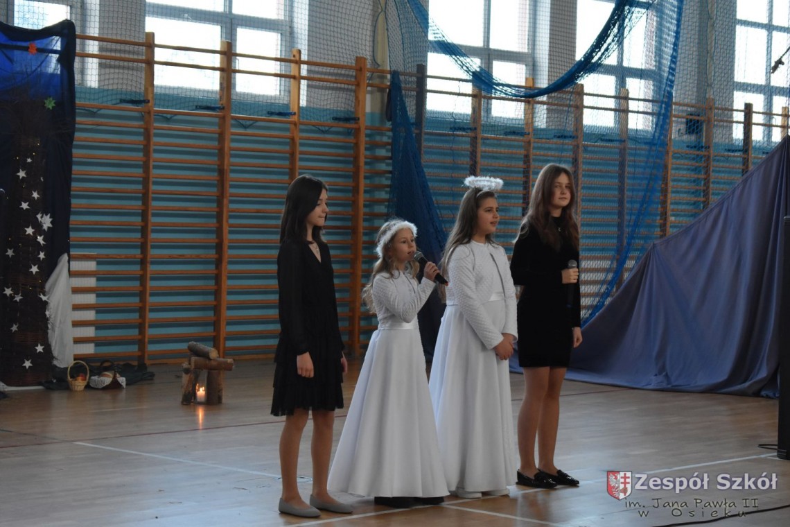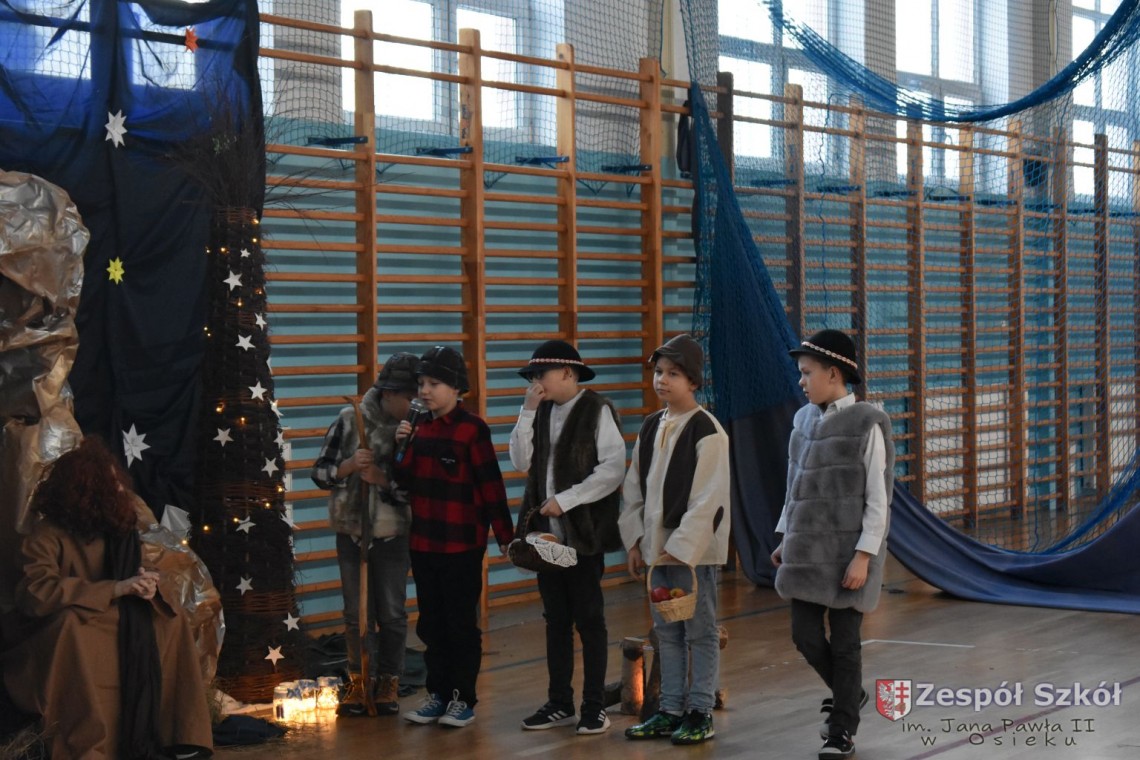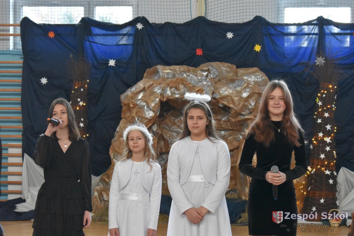 W klimacie nadchodzących Świąt Bożego Narodzenia i blasku choinkowych świec 22 grudnia 2022 roku w naszej szkole zostały wystawione Jasełka Bożonarodzeniowe. Biblijne wydarzenia sprzed 2000 lat odtworzyli uczniowie Zespołu Szkół im. Jana Pawła II w Osieku. Rozważając tajemnicę Bożego Narodzenia zostaliśmy przeniesieni myślą i sercem do Ziemi Świętej snując głębokie refleksje nad ,,Cudem Świętej Nocy’’, gdzie w ubogiej stajence narodził się Jezus. Piękna scenografia wprowadziła zgromadzoną publiczność w świąteczny nastrój, a młodzi aktorzy przedstawili sceny narodzin Chrystusa. O piękne przeżycia i miłe doznania słuchowe zadbali zdolni aktorzy i wokaliści naszej szkoły. Uczniowie mieli możliwość uczestniczenia w tradycji, a także zaprezentowania swoich umiejętności artystycznych. Przedstawienie jasełkowe było dla nas wszystkich lekcją wzajemnego zbliżenia, miłości, zadumy i refleksji.