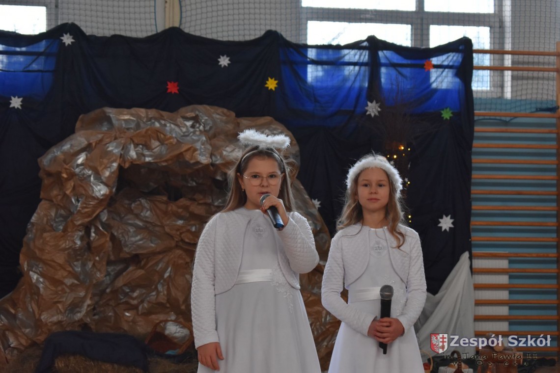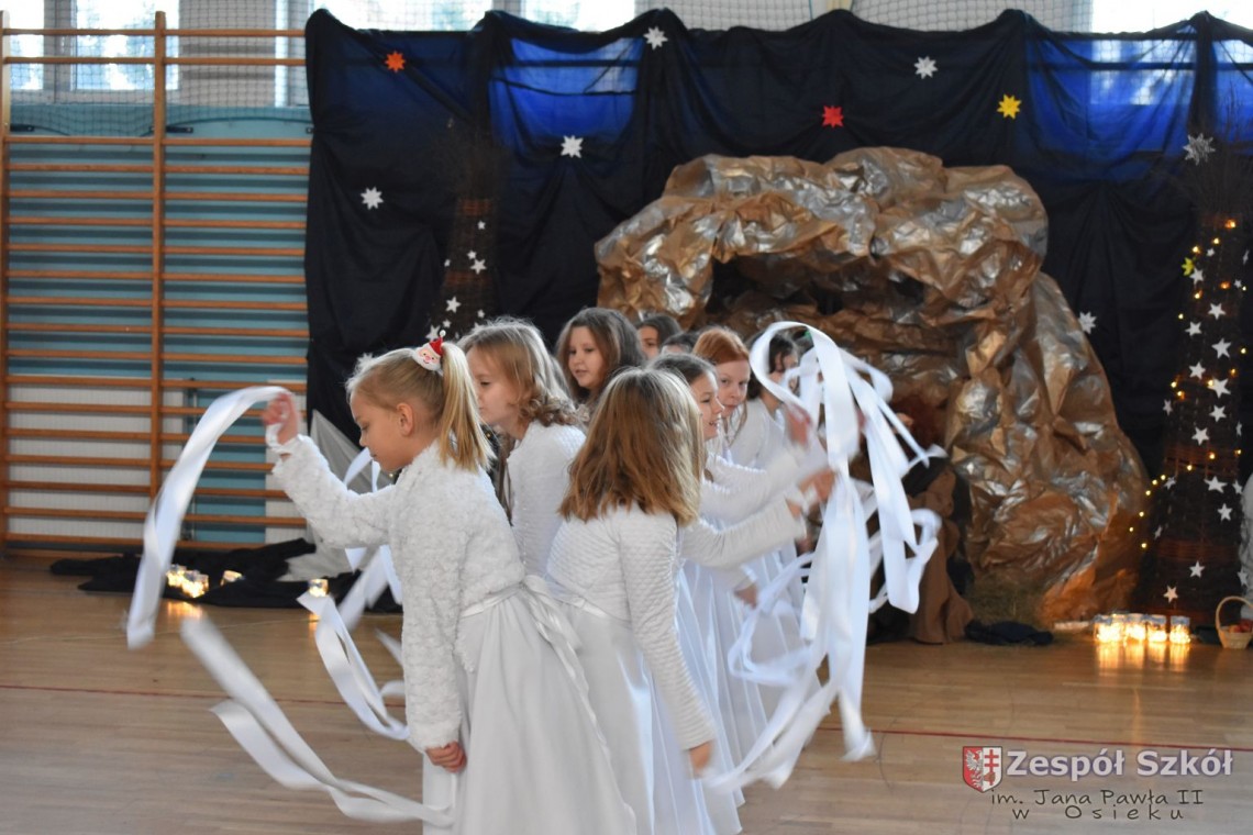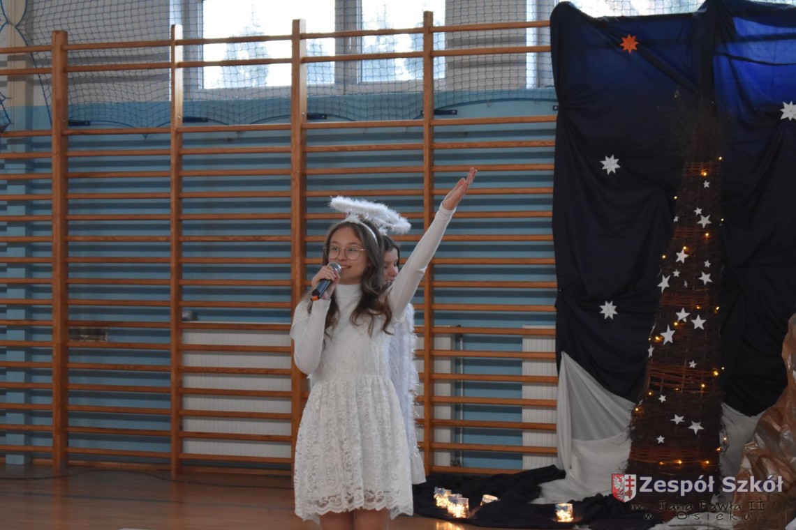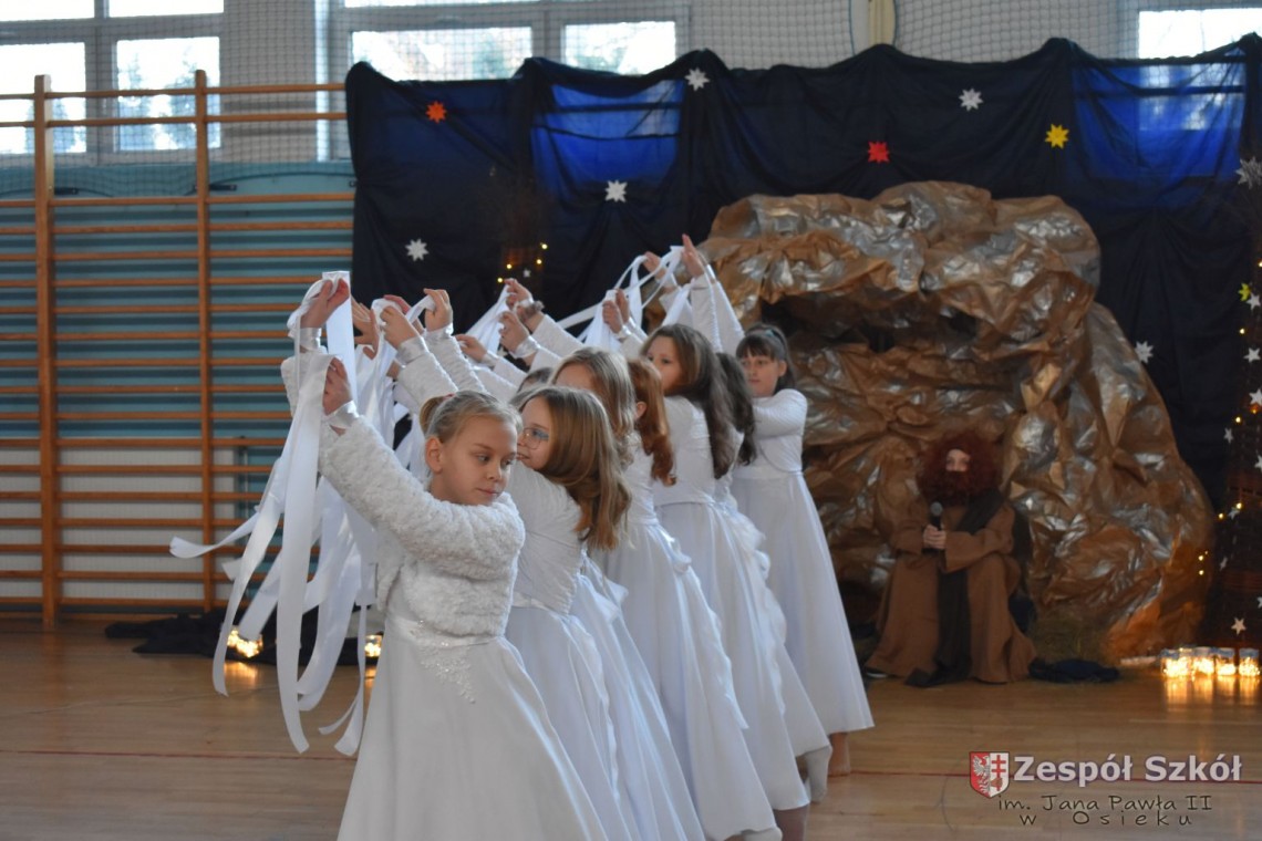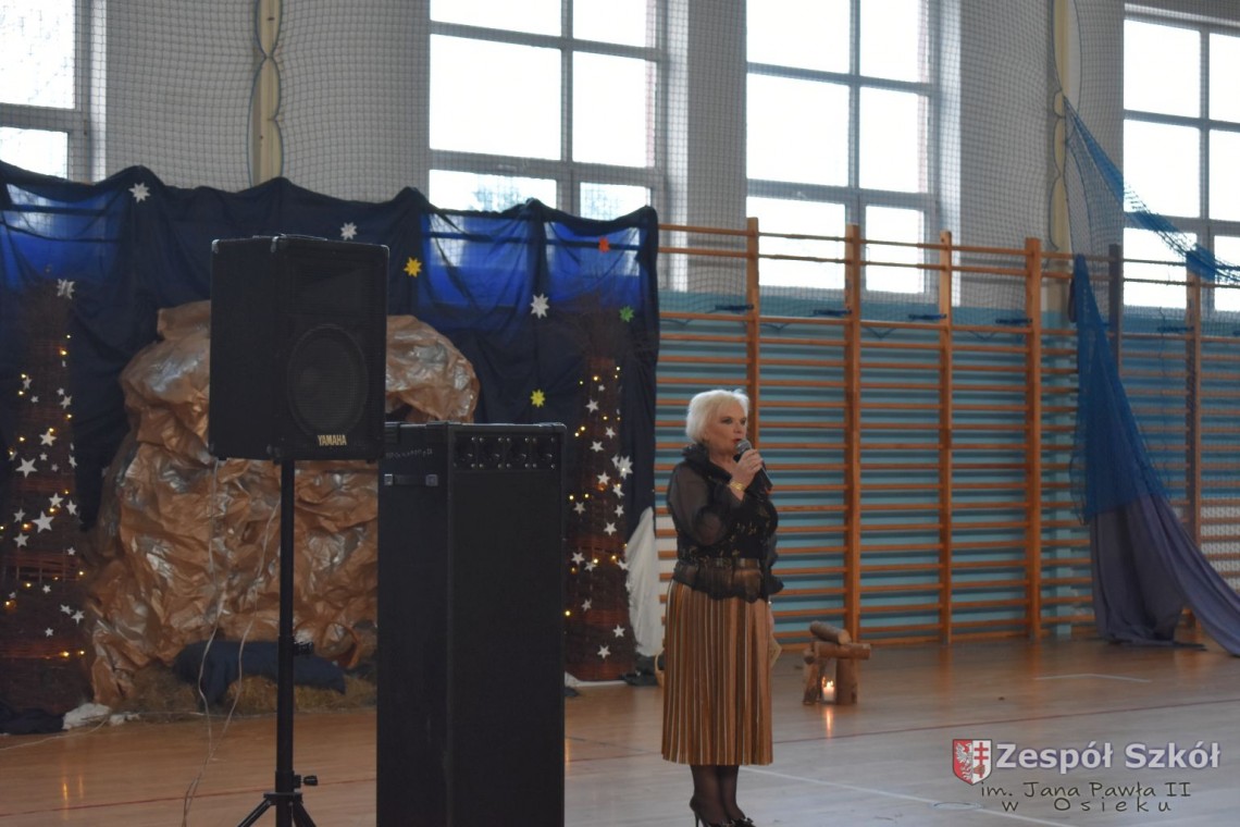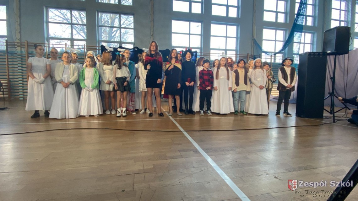 W klimacie nadchodzących Świąt Bożego Narodzenia i blasku choinkowych świec 22 grudnia 2022 roku w naszej szkole zostały wystawione Jasełka Bożonarodzeniowe. Biblijne wydarzenia sprzed 2000 lat odtworzyli uczniowie Zespołu Szkół im. Jana Pawła II w Osieku. Rozważając tajemnicę Bożego Narodzenia zostaliśmy przeniesieni myślą i sercem do Ziemi Świętej snując głębokie refleksje nad ,,Cudem Świętej Nocy’’, gdzie w ubogiej stajence narodził się Jezus. Piękna scenografia wprowadziła zgromadzoną publiczność w świąteczny nastrój, a młodzi aktorzy przedstawili sceny narodzin Chrystusa. O piękne przeżycia i miłe doznania słuchowe zadbali zdolni aktorzy i wokaliści naszej szkoły. Uczniowie mieli możliwość uczestniczenia w tradycji, a także zaprezentowania swoich umiejętności artystycznych. Przedstawienie jasełkowe było dla nas wszystkich lekcją wzajemnego zbliżenia, miłości, zadumy i refleksji.
