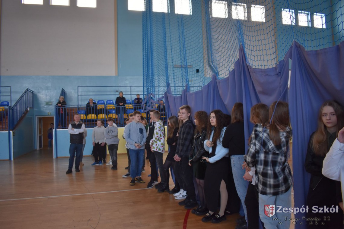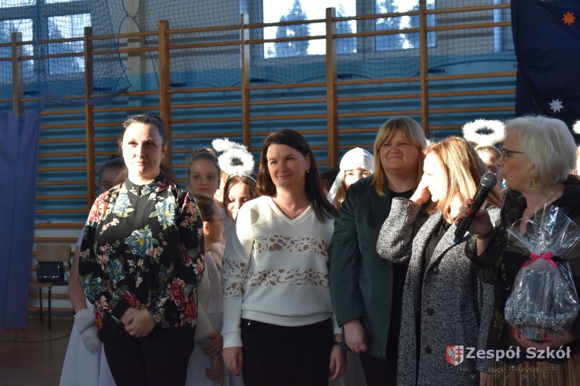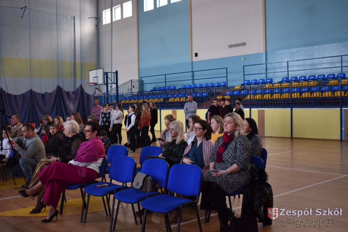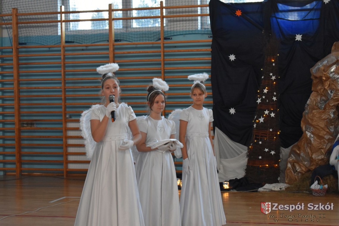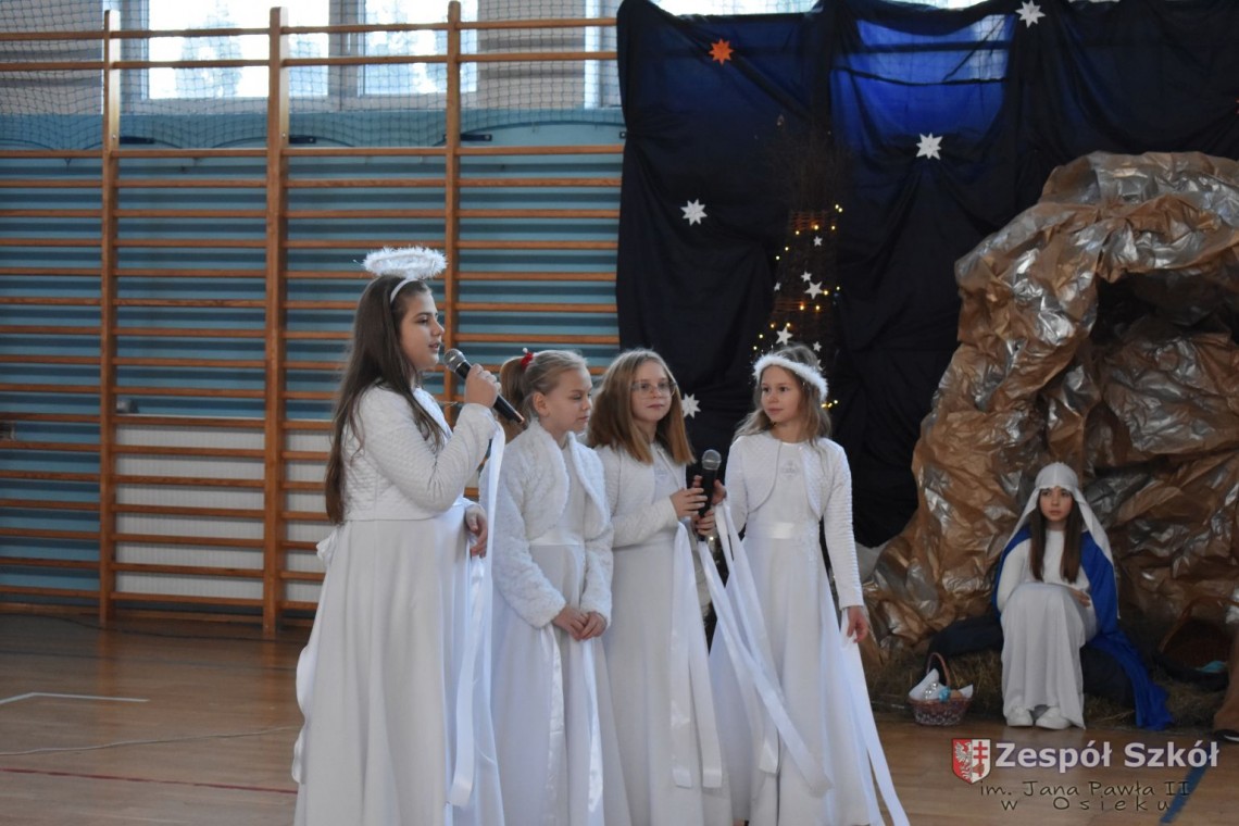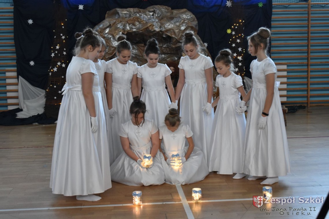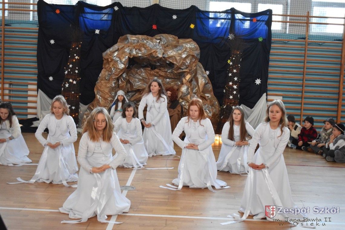W klimacie nadchodzących Świąt Bożego Narodzenia i blasku choinkowych świec 22 grudnia 2022 roku w naszej szkole zostały wystawione Jasełka Bożonarodzeniowe. Biblijne wydarzenia sprzed 2000 lat odtworzyli uczniowie Zespołu Szkół im. Jana Pawła II w Osieku. Rozważając tajemnicę Bożego Narodzenia zostaliśmy przeniesieni myślą i sercem do Ziemi Świętej snując głębokie refleksje nad ,,Cudem Świętej Nocy’’, gdzie w ubogiej stajence narodził się Jezus. Piękna scenografia wprowadziła zgromadzoną publiczność w świąteczny nastrój, a młodzi aktorzy przedstawili sceny narodzin Chrystusa. O piękne przeżycia i miłe doznania słuchowe zadbali zdolni aktorzy i wokaliści naszej szkoły. Uczniowie mieli możliwość uczestniczenia w tradycji, a także zaprezentowania swoich umiejętności artystycznych. Przedstawienie jasełkowe było dla nas wszystkich lekcją wzajemnego zbliżenia, miłości, zadumy i refleksji.