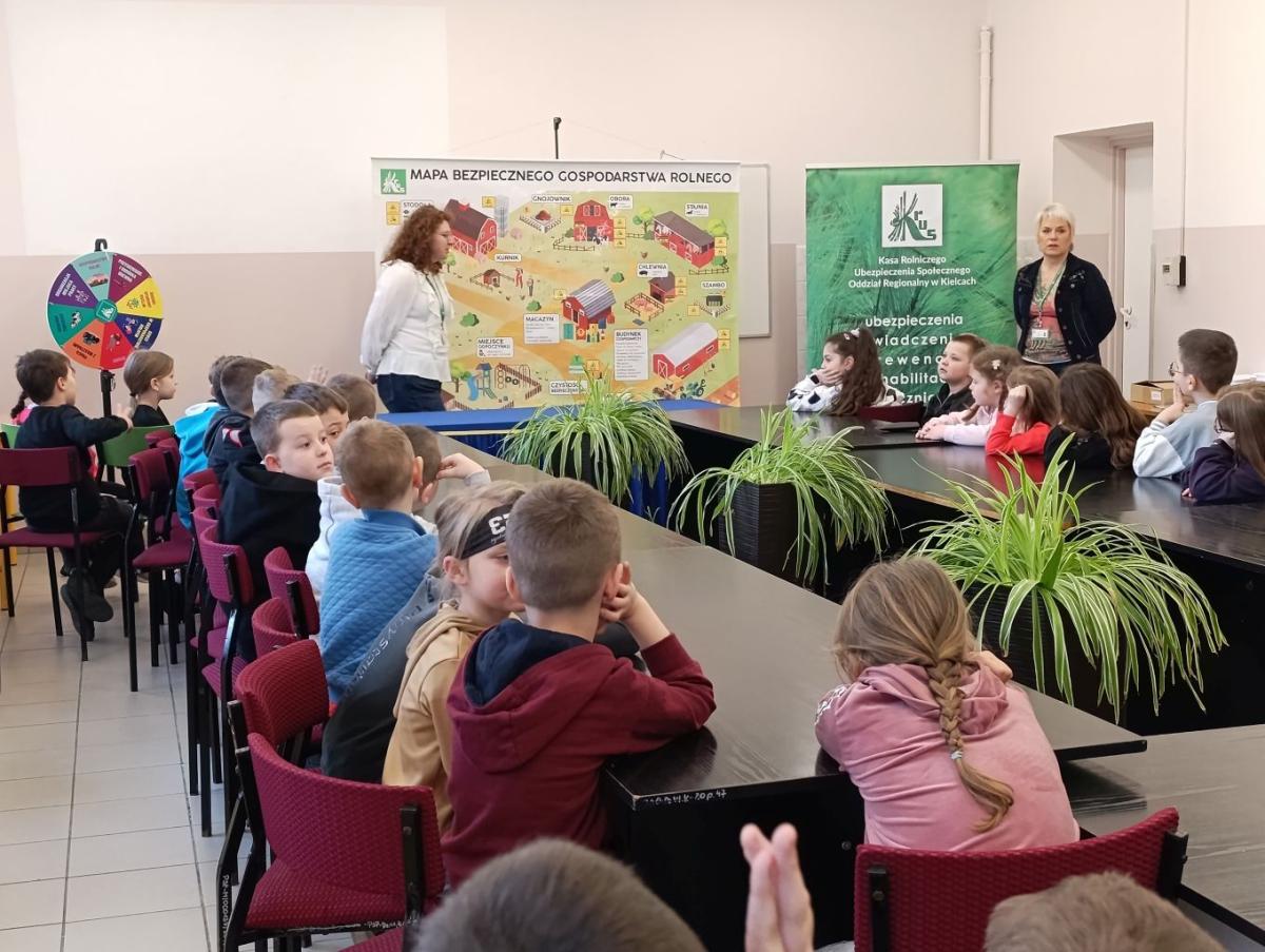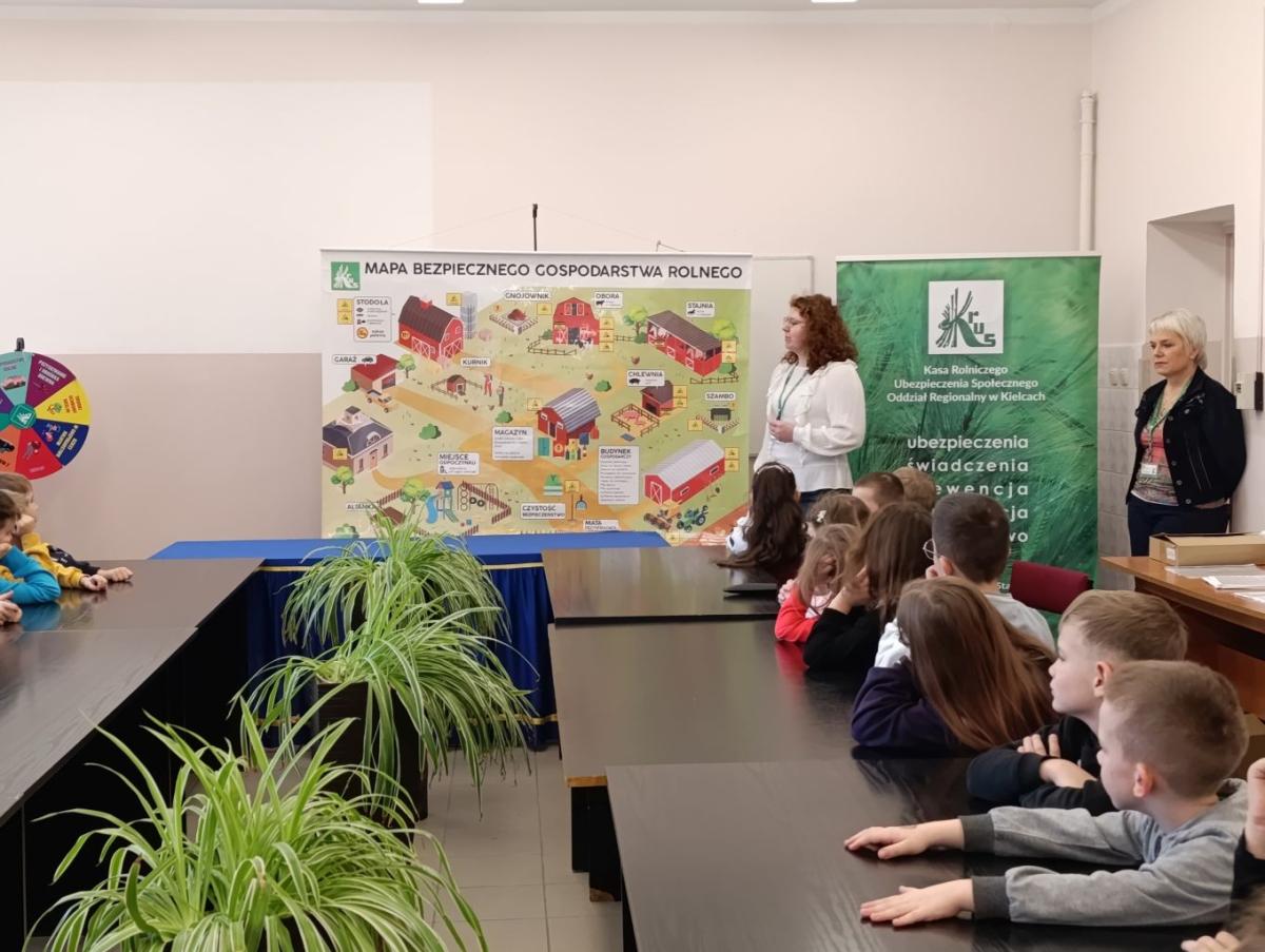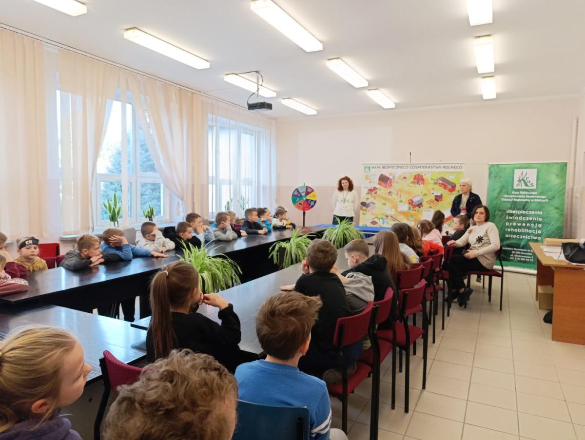 W dniu 11 lutego 2026 r. uczniowie z klas I-III uczestniczyli w spotkaniu z przedstawicielami Kasy Rolniczego Ubezpieczenia Społecznego ze Staszowa na temat "Jak bezpiecznie pomagać w gospodarstwie rolnym?”. Głównym celem spotkania było podniesienie świadomości dzieci na temat bezpieczeństwa na wsi ze szczególnym uwzględnieniem zagrożeń występujących w gospodarstwach rolnych i ich otoczeniu. Uczniowie dowiedzieli się również jak bezpiecznie pomagać w pracach domowych i rolnych, unikać niebezpiecznych sytuacji oraz jak prawidłowo reagować w razie zagrożenia. Spotkanie miało charakter edukacyjny i profilaktyczny. Dzieci zostały również zachęcone do udziału w XVI Ogólnopolskim Konkursie Plastycznym „Wioski bez troski”, którego celem jest promowanie prawidłowych zachowań dzieci podczas przebywania na terenie gospodarstw rolnych.