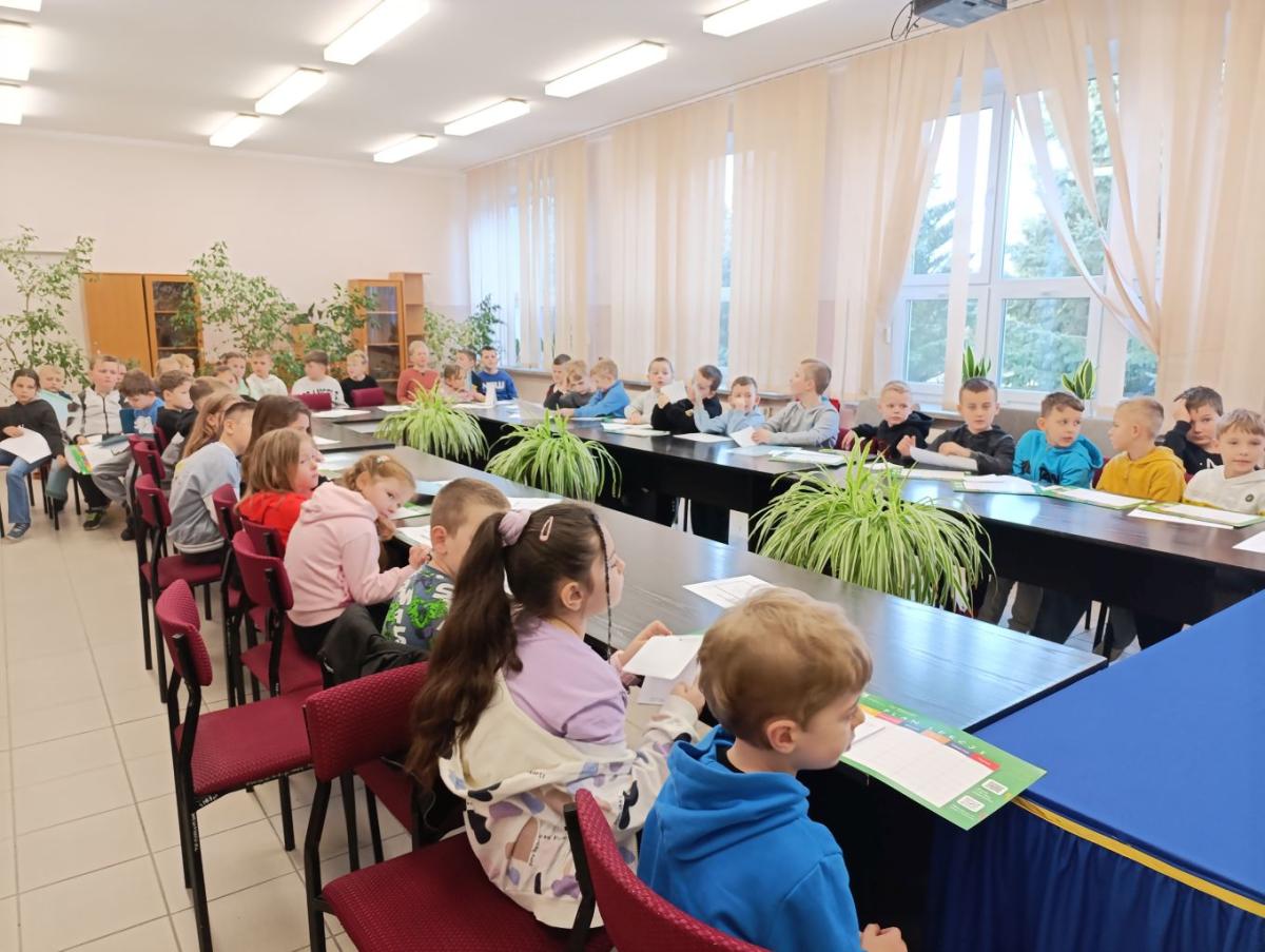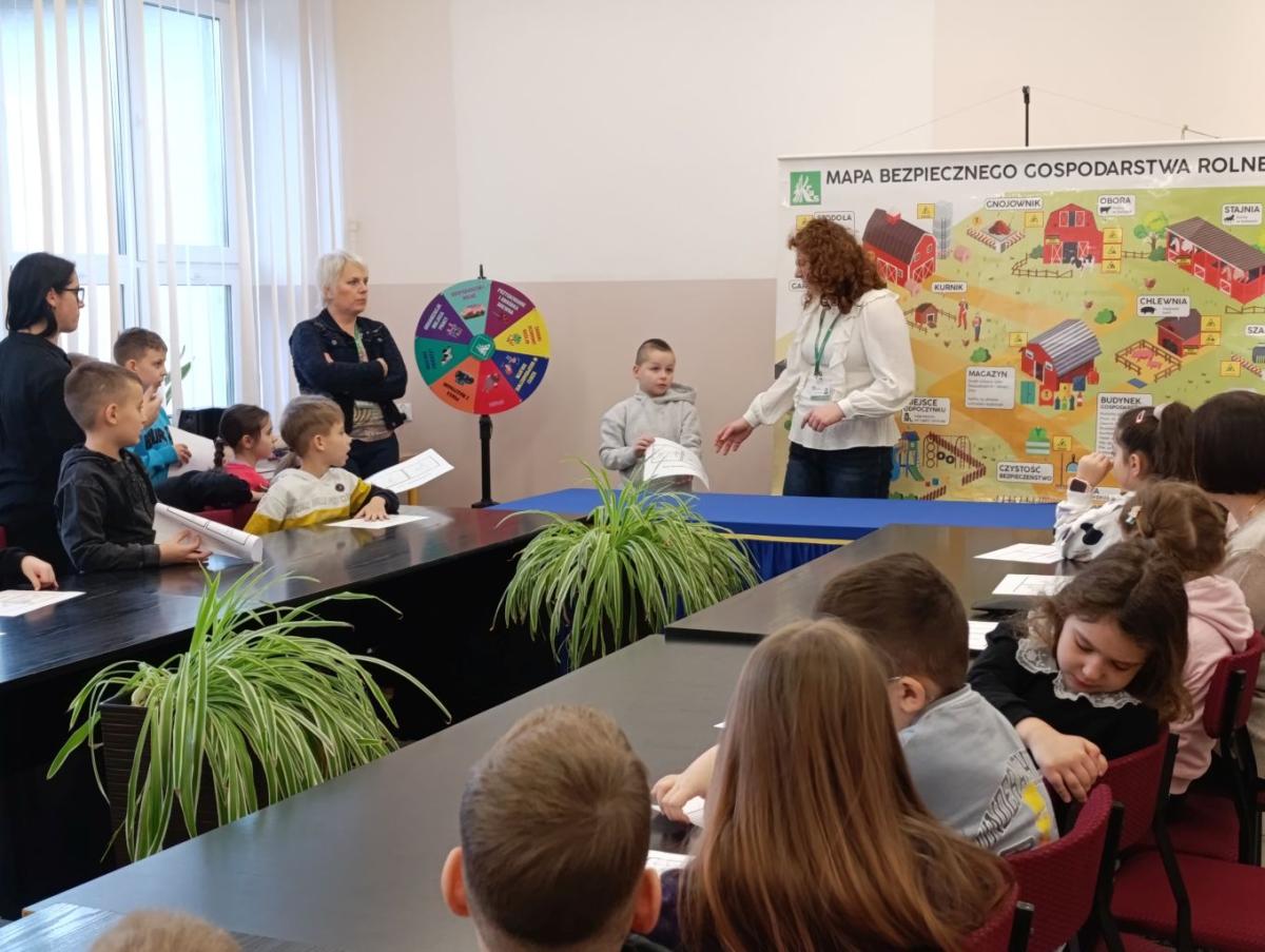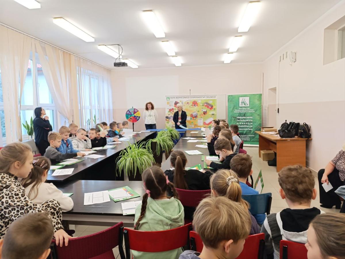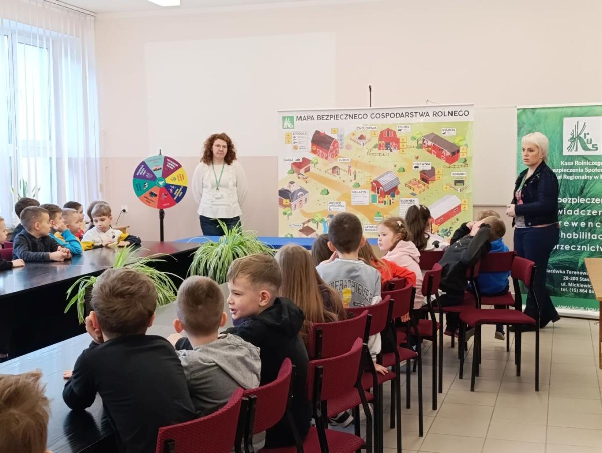 W dniu 11 lutego 2026 r. uczniowie z klas I-III uczestniczyli w spotkaniu z przedstawicielami Kasy Rolniczego Ubezpieczenia Społecznego ze Staszowa na temat "Jak bezpiecznie pomagać w gospodarstwie rolnym?”. Głównym celem spotkania było podniesienie świadomości dzieci na temat bezpieczeństwa na wsi ze szczególnym uwzględnieniem zagrożeń występujących w gospodarstwach rolnych i ich otoczeniu. Uczniowie dowiedzieli się również jak bezpiecznie pomagać w pracach domowych i rolnych, unikać niebezpiecznych sytuacji oraz jak prawidłowo reagować w razie zagrożenia. Spotkanie miało charakter edukacyjny i profilaktyczny. Dzieci zostały również zachęcone do udziału w XVI Ogólnopolskim Konkursie Plastycznym „Wioski bez troski”, którego celem jest promowanie prawidłowych zachowań dzieci podczas przebywania na terenie gospodarstw rolnych.