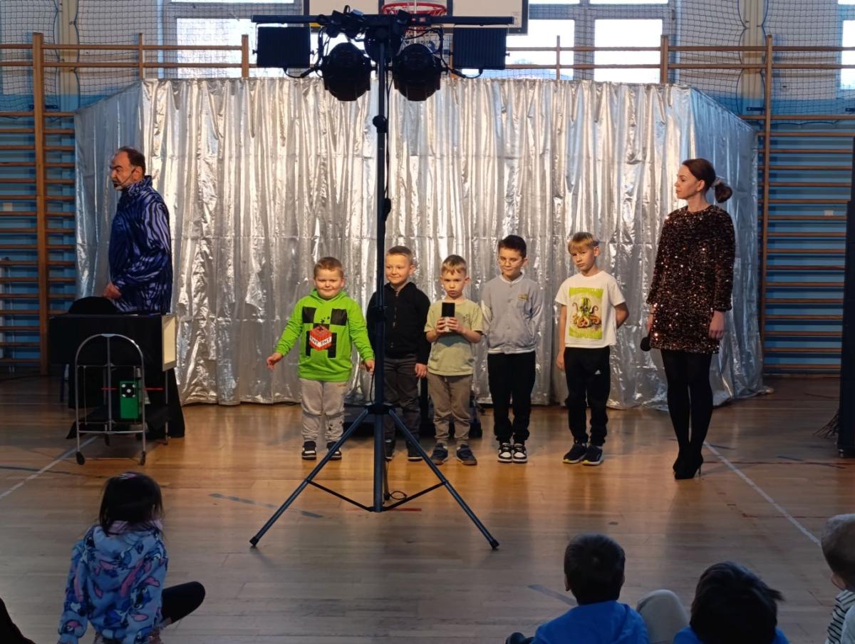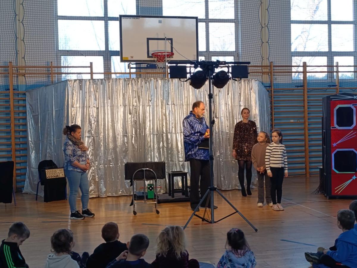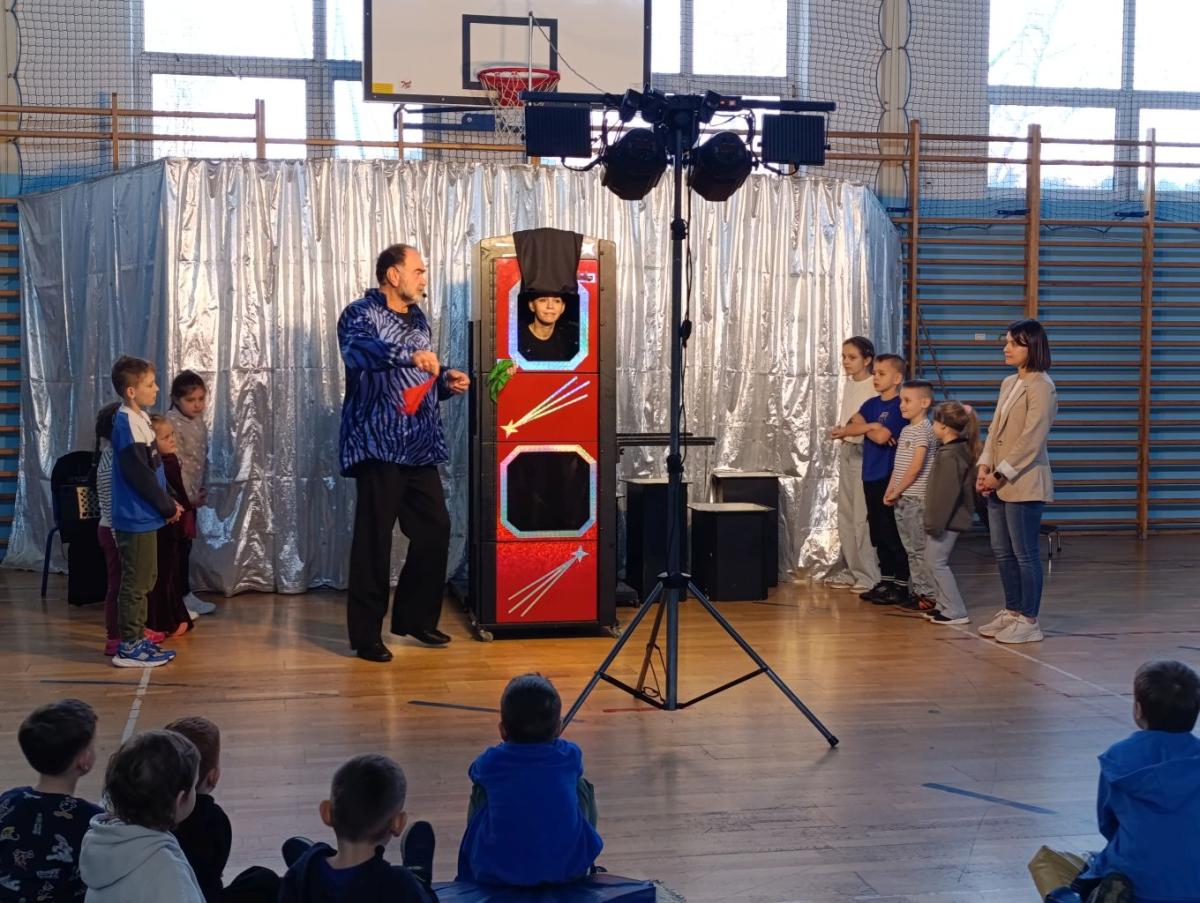 Dnia 18 marca 2026r. naszą szkołę odwiedził iluzjonista, który zgromadził najmłodszych uczniów i przeniósł we wspaniały świat iluzji, humoru i dobrej zabawy. Na scenie działy się rzeczy niesamowite, zaczarowane, wśród których znalazły się: znikające przedmioty, pojawiające się znikąd rekwizyty czy lewitująca asystentka. Magiczne sztuczki odbywały się z aktywnym udziałem dzieci, które chętnie zgłaszały się do pomocy, wypowiadały magiczne zaklęcia i z zaciekawieniem obserwowały każdy ruch artysty. Występ był nie tylko świetną zabawą, ale również okazją do rozwijania wyobraźni, kreatywności i ciekawości świata. Spotkanie przebiegło w bardzo miłej i radosnej atmosferze. Uczniowie nagrodzili artystę gromkimi brawami, a uśmiechy na twarzach były najlepszym dowodem na to, jak bardzo podobał im się występ.