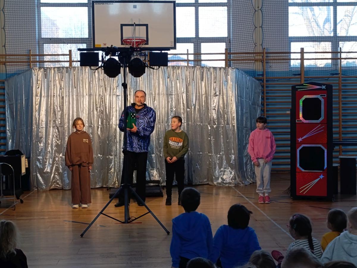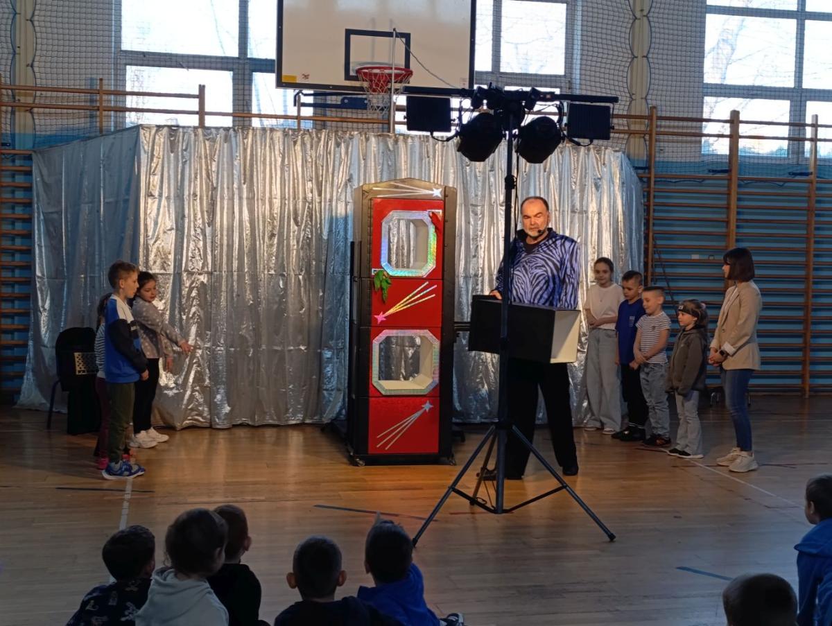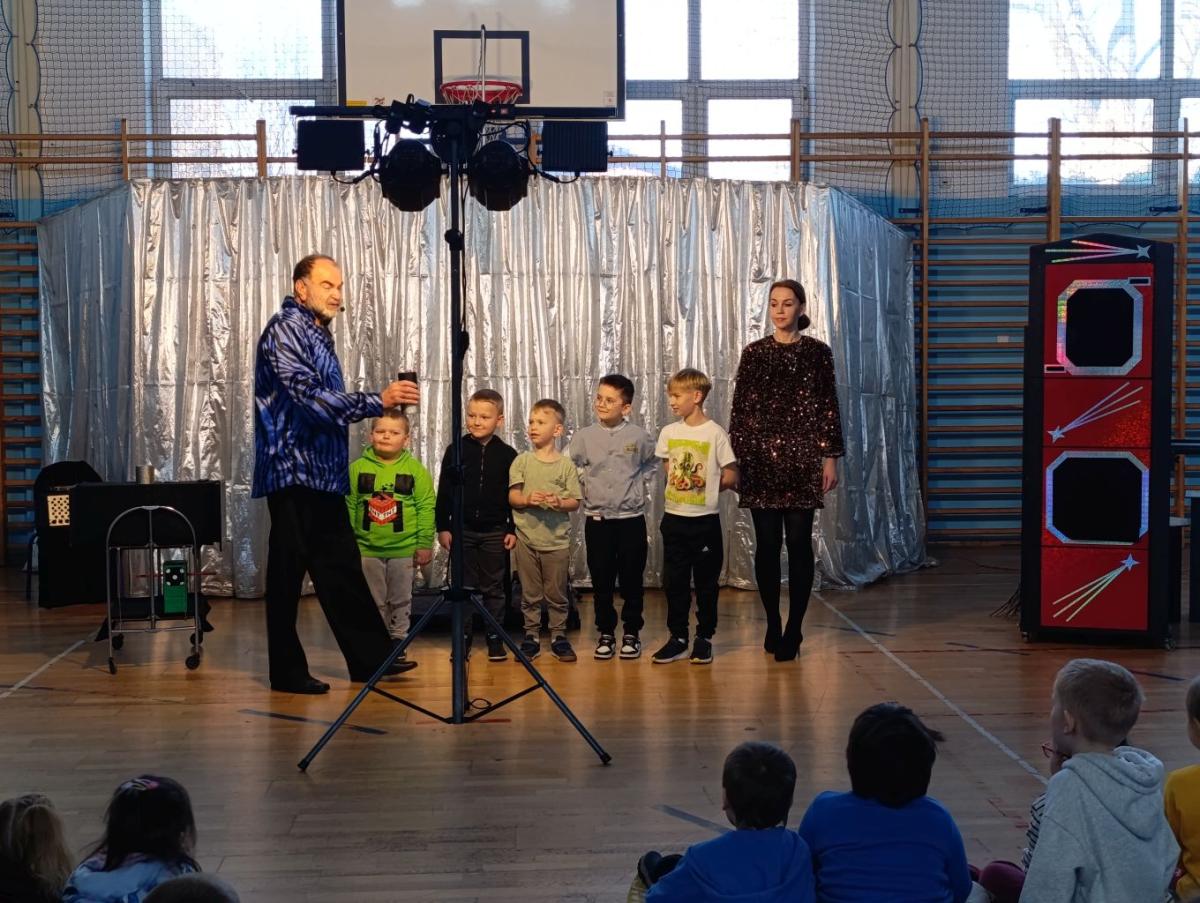 Dnia 18 marca 2026r. naszą szkołę odwiedził iluzjonista, który zgromadził najmłodszych uczniów i przeniósł we wspaniały świat iluzji, humoru i dobrej zabawy. Na scenie działy się rzeczy niesamowite, zaczarowane, wśród których znalazły się: znikające przedmioty, pojawiające się znikąd rekwizyty czy lewitująca asystentka. Magiczne sztuczki odbywały się z aktywnym udziałem dzieci, które chętnie zgłaszały się do pomocy, wypowiadały magiczne zaklęcia i z zaciekawieniem obserwowały każdy ruch artysty. Występ był nie tylko świetną zabawą, ale również okazją do rozwijania wyobraźni, kreatywności i ciekawości świata. Spotkanie przebiegło w bardzo miłej i radosnej atmosferze. Uczniowie nagrodzili artystę gromkimi brawami, a uśmiechy na twarzach były najlepszym dowodem na to, jak bardzo podobał im się występ.