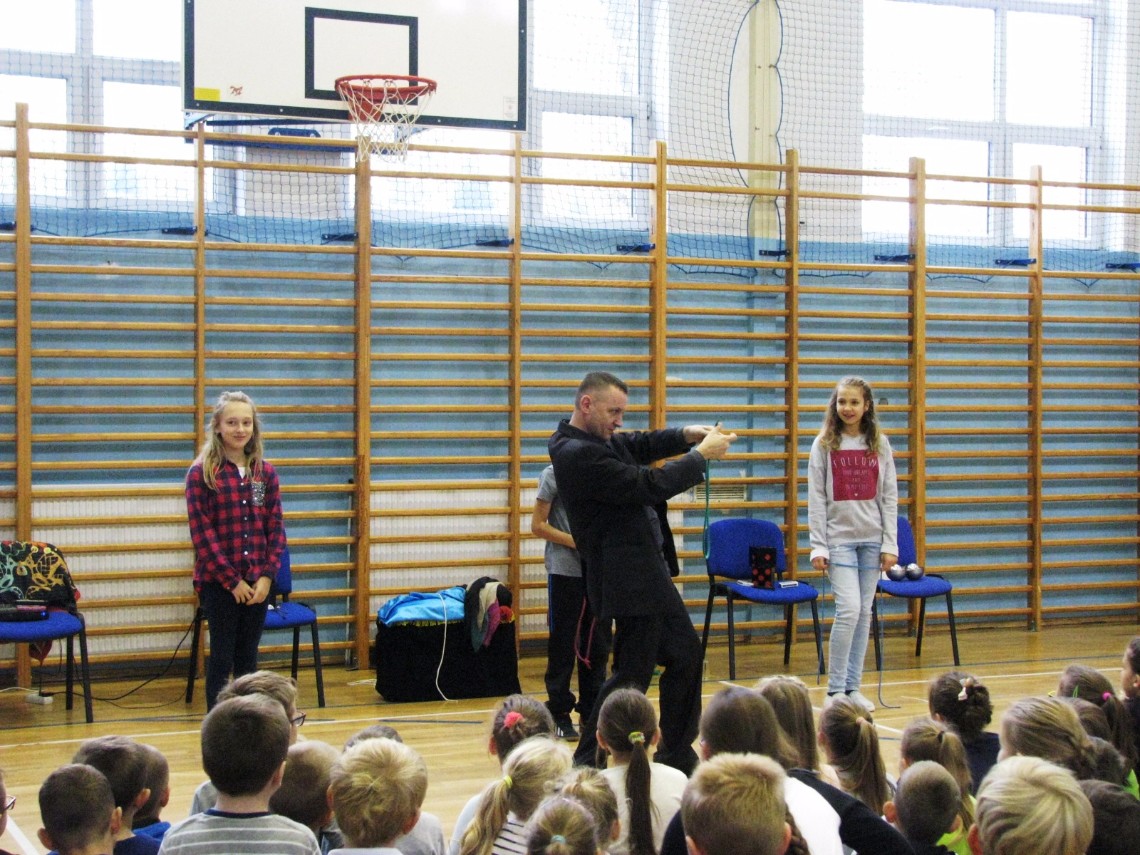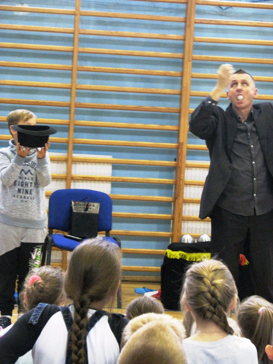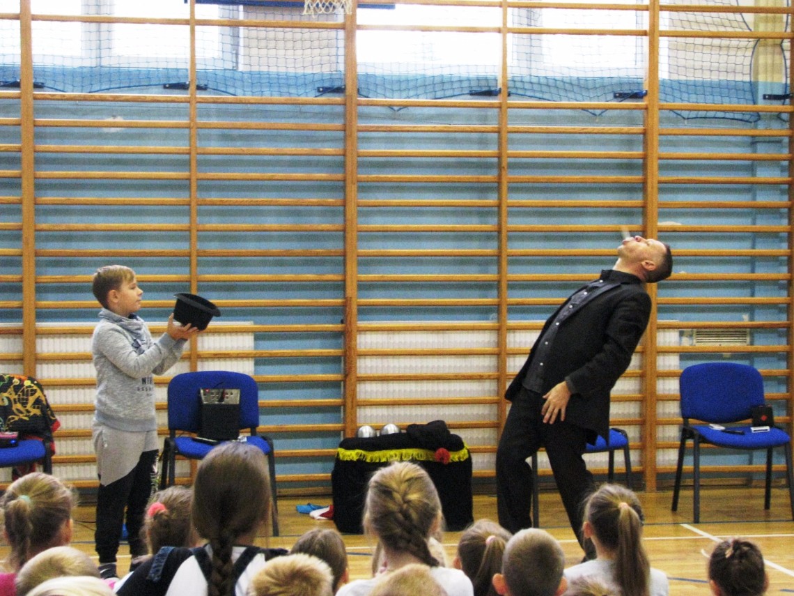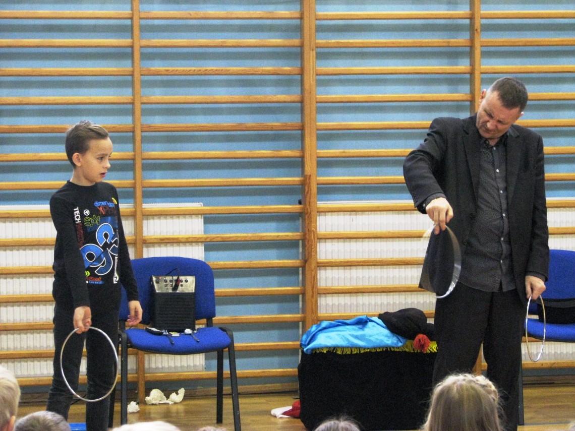20 października 2016r. klasy I – VI uczestniczyły w pokazie sztuczek wykonanych przez iluzjonistę pana Ryszarda Goclona. Zaprezentował on program „Magic Show”, podczas którego mogliśmy podziwiać magiczne triki, przy użyciu kart, sznurków, kół i piłek. Do asystowania przy wykonywaniu różnorodnych trików zaangażował wybranych uczniów.